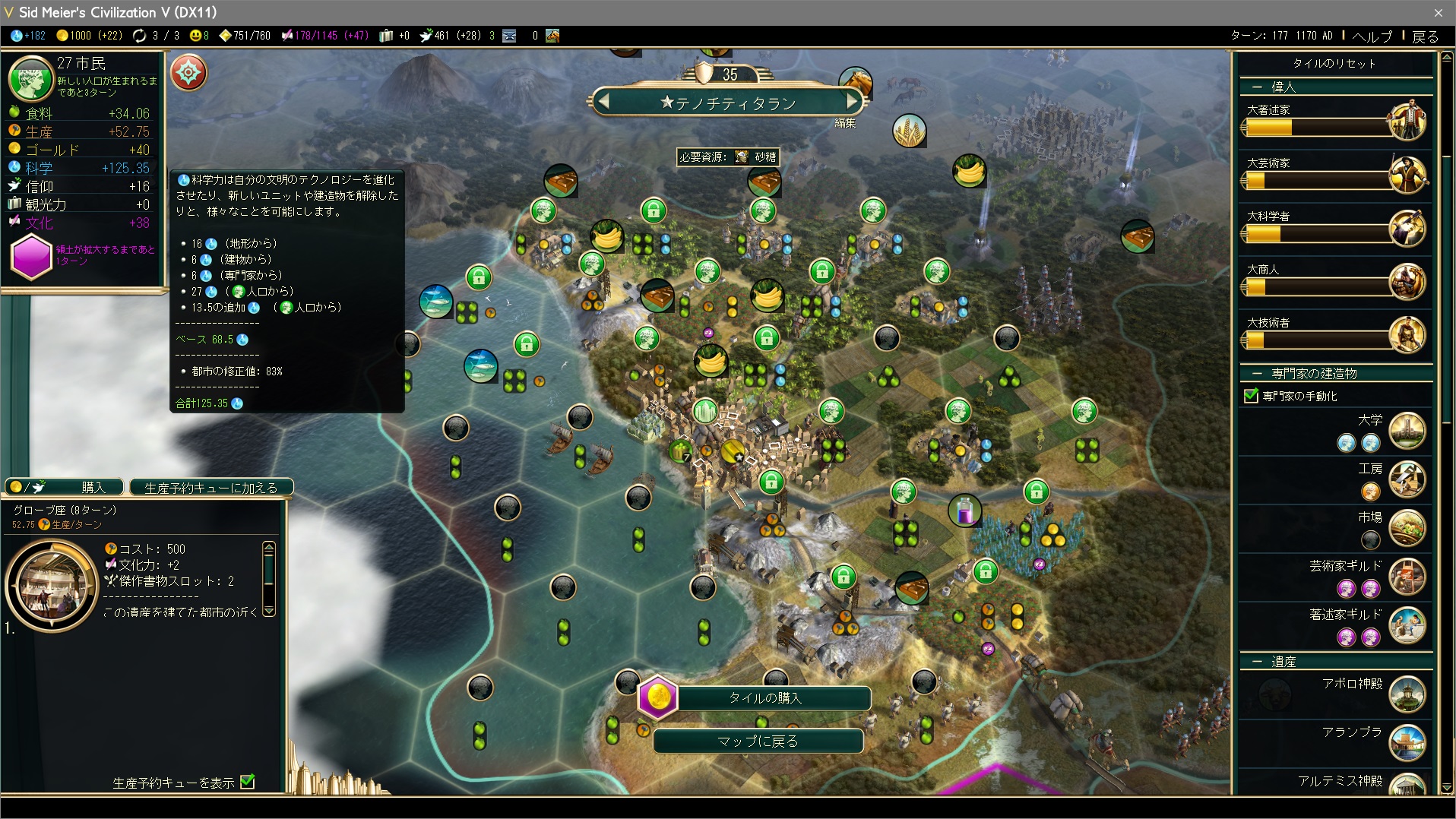 とはいえわざわざ建て直す必要なんてないんだから、全て首都に建てよう。前作Civ4では首都とは別に専門家雇用に特化した偉人都市をつくったものだが、Civ5では首都を偉人都市とするのがベターだろう。