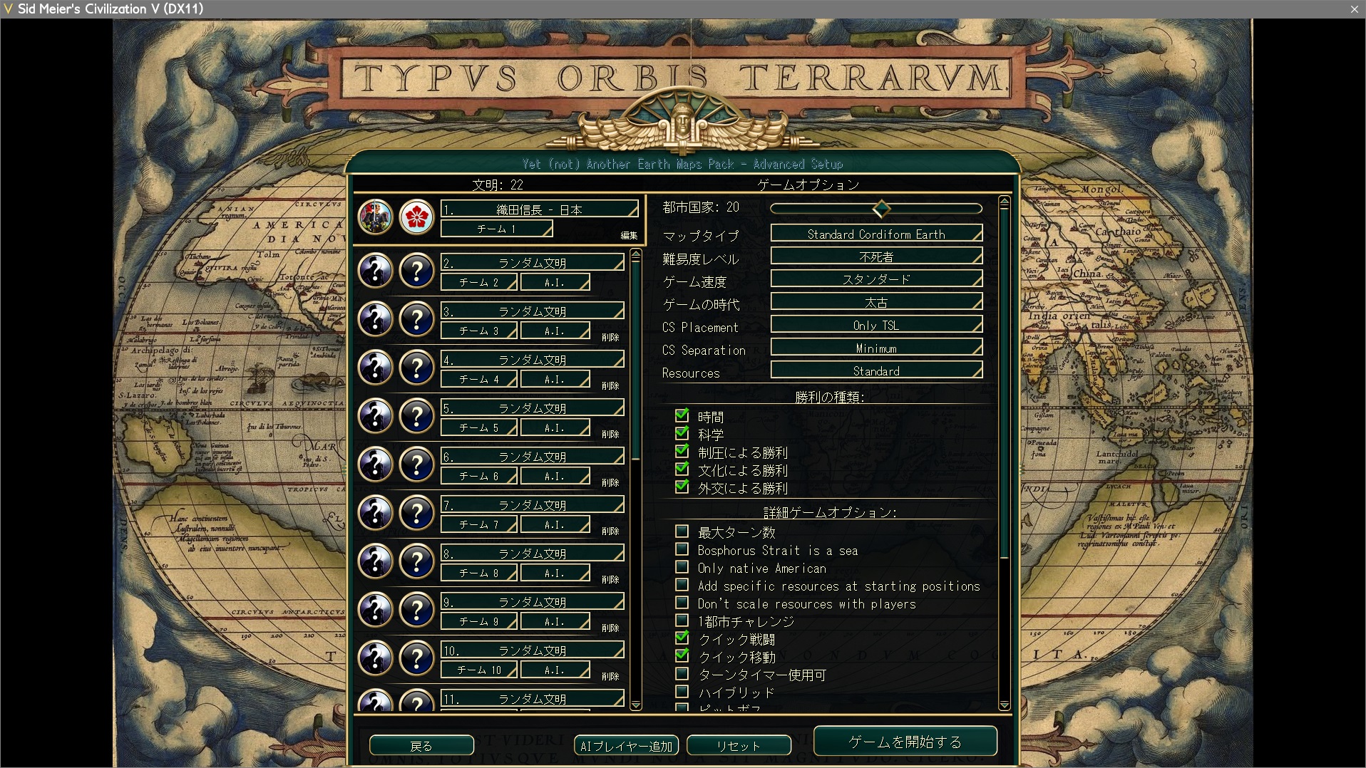 ゲームセットアップは日本の織田信長、文明:22、都市国家:20、マップタイプ:Standard Cordiform Earth、難易度:不死者、ゲーム速度:スタンダード、CS Placement:Only TSL、CS Separation:Standard。