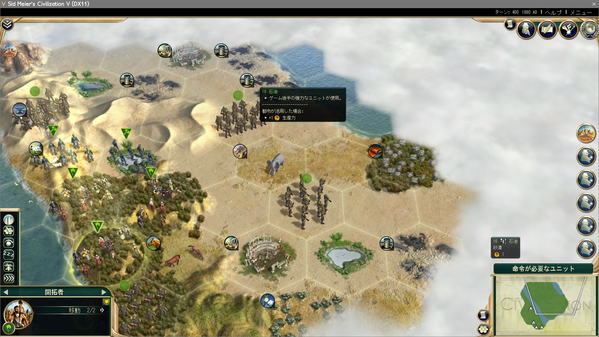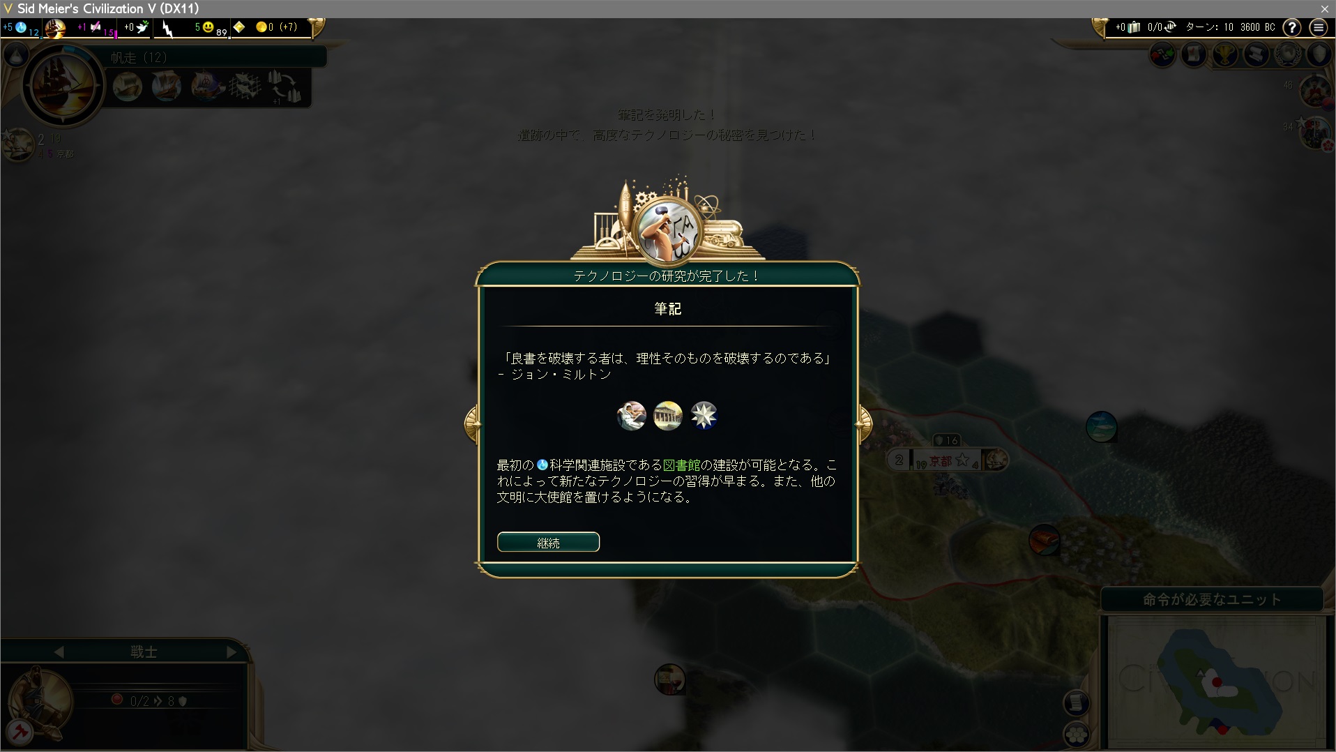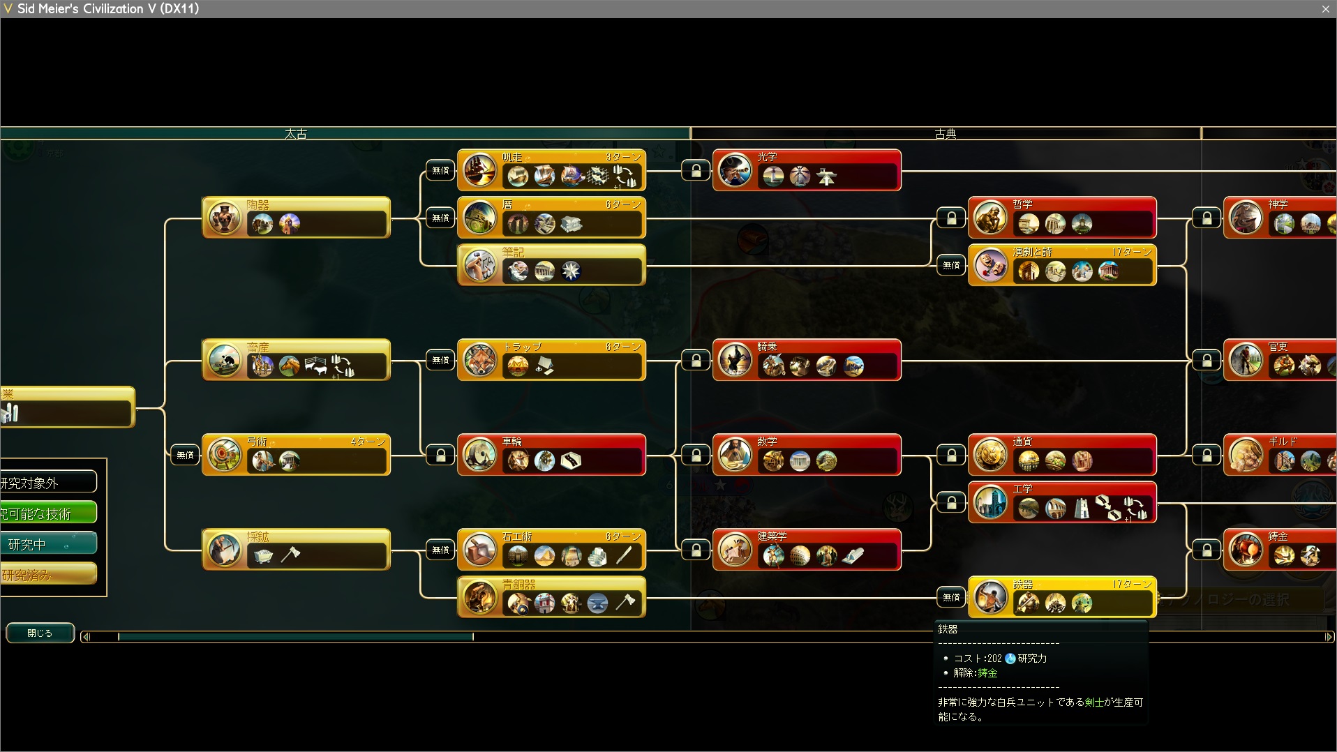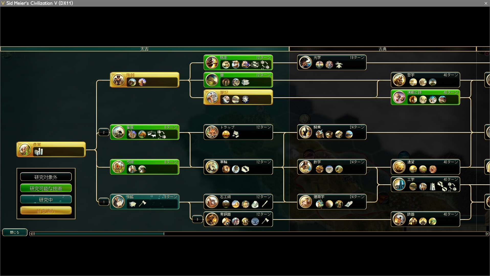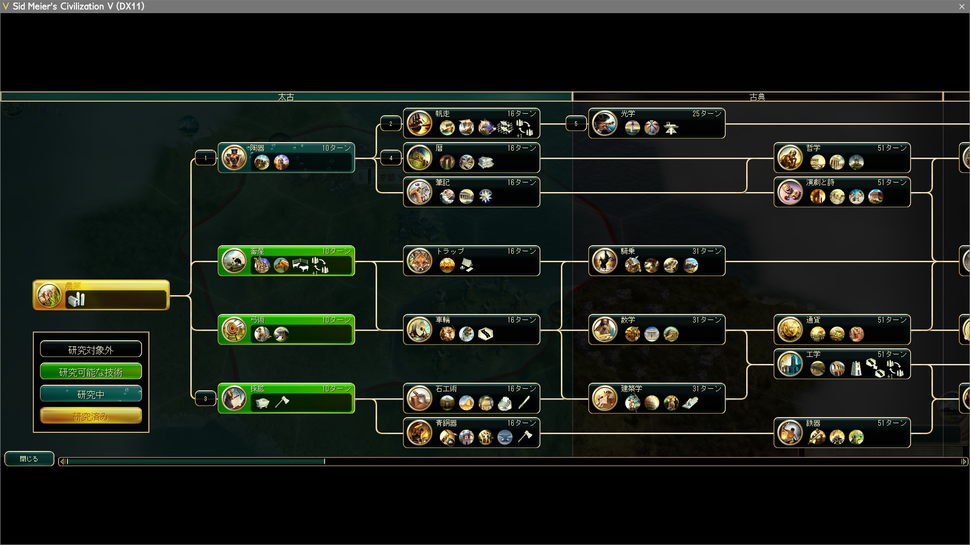 研究は陶器→帆走→採鉱→暦→光学と、多島海プレイのように進める。全世界マップは予め地形がわかっているので、初手の行動は文明ごとに固定のものになるだろう。