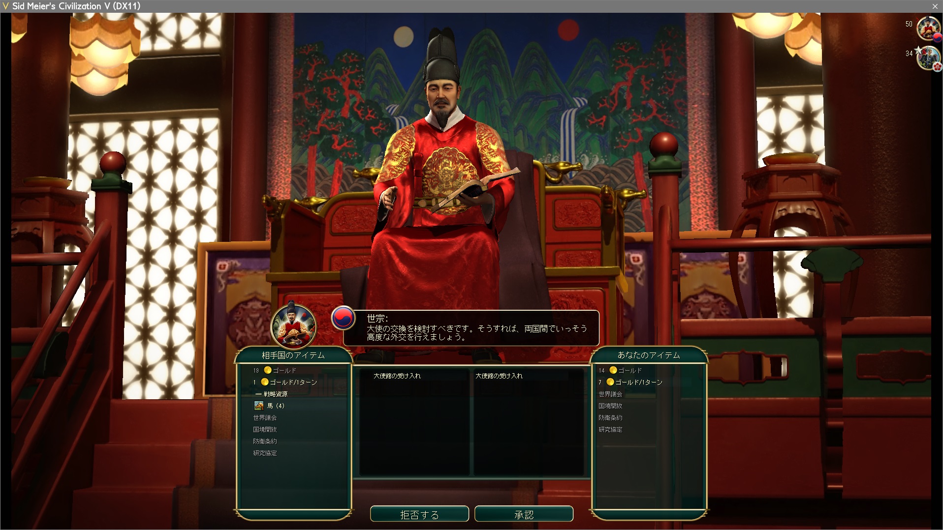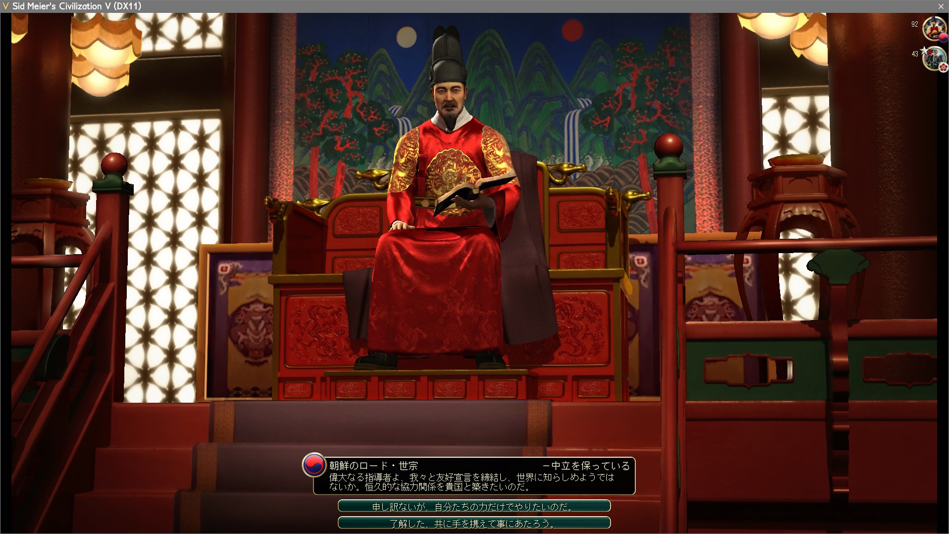 遭遇して約20ターン後に友好宣言。朝鮮は友好宣言を結びやすい:Bだ。ついでに第二都市を建てるまで持て余す高級資源を