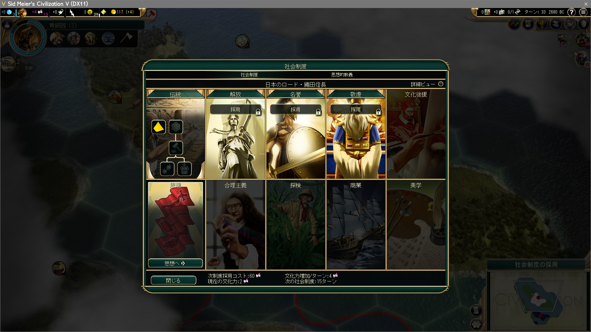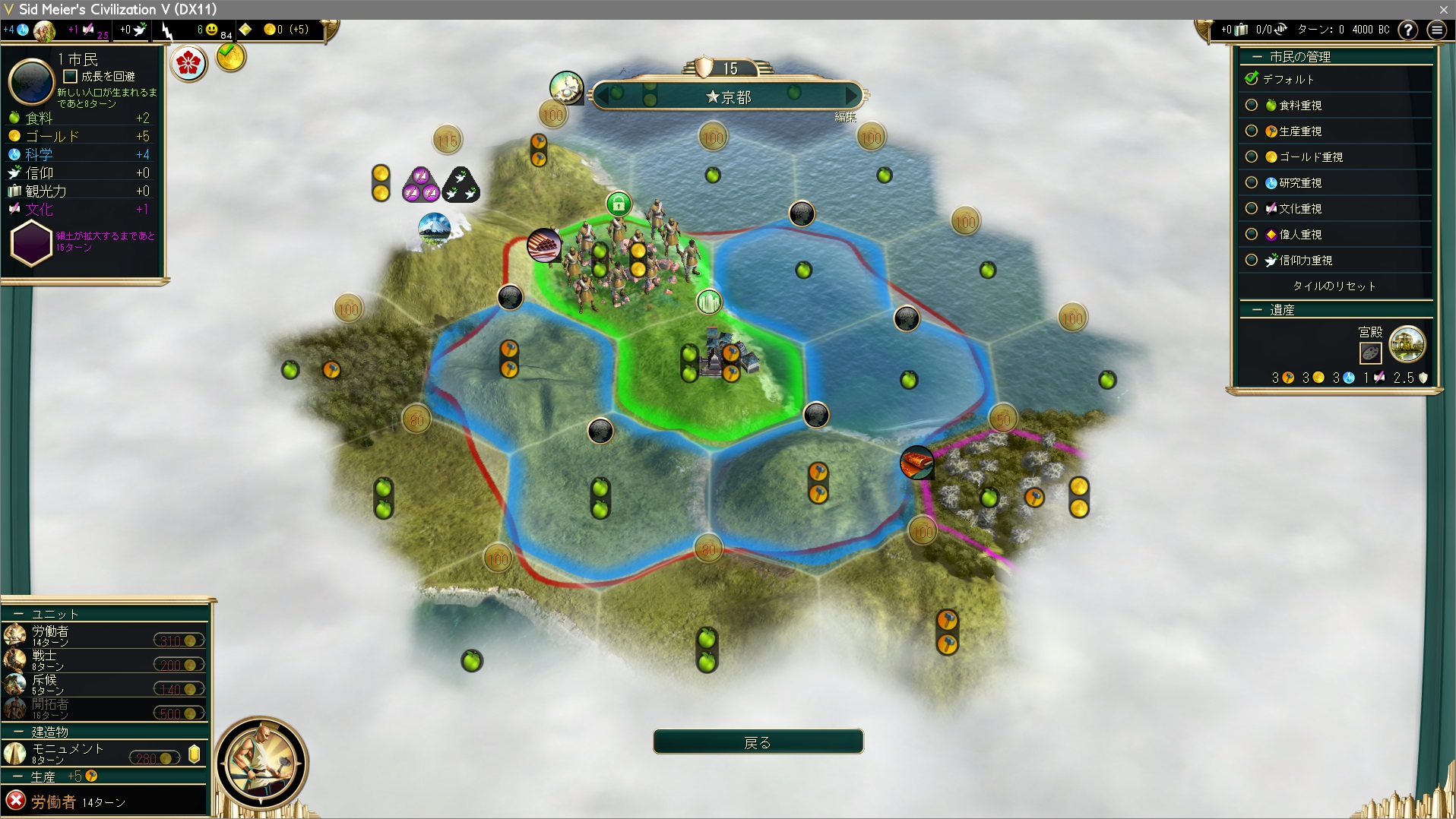 首都:京都を建設。富士山は食料産出がないので、ド序盤に市民配置すると都市の出力が伸び悩む。首都の発展を犠牲にすれば宗教創始は可能だが…