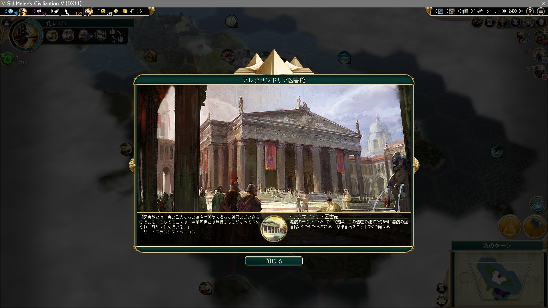 ターン39、アレクサンドリア図書館完成!今思えば22文明もいるのによく間に合ったな。理由はよくわからんが、文明ぎゅうぎゅう詰めだから開拓者急がなきゃってAIが考えたからとか?