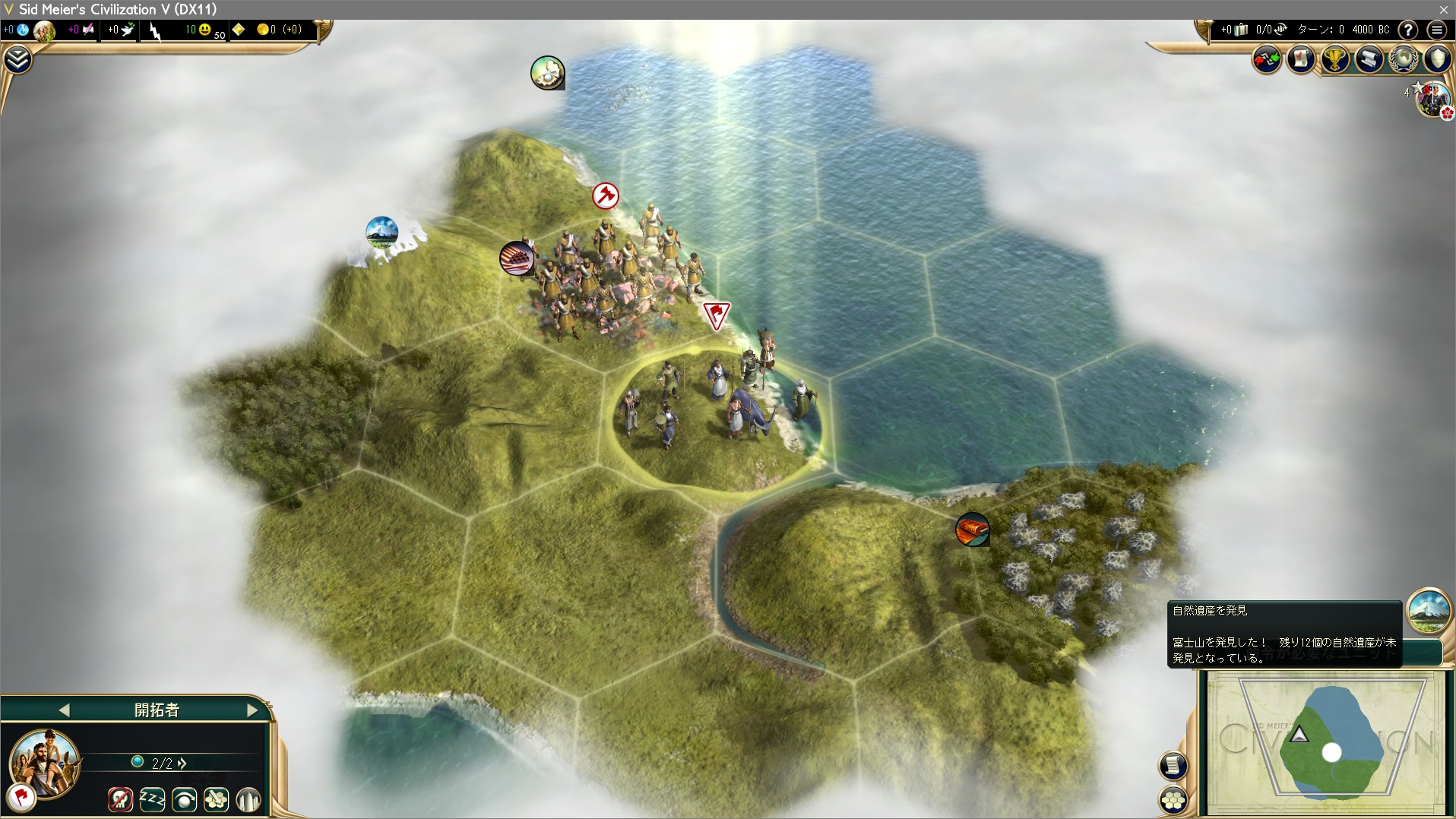 ゲームスタート!富士山ありますねぇ!メルカトル図法のマップじゃないからわかりにくいが、開拓者の初期位置は近畿らへん。いや、これ尾張か?