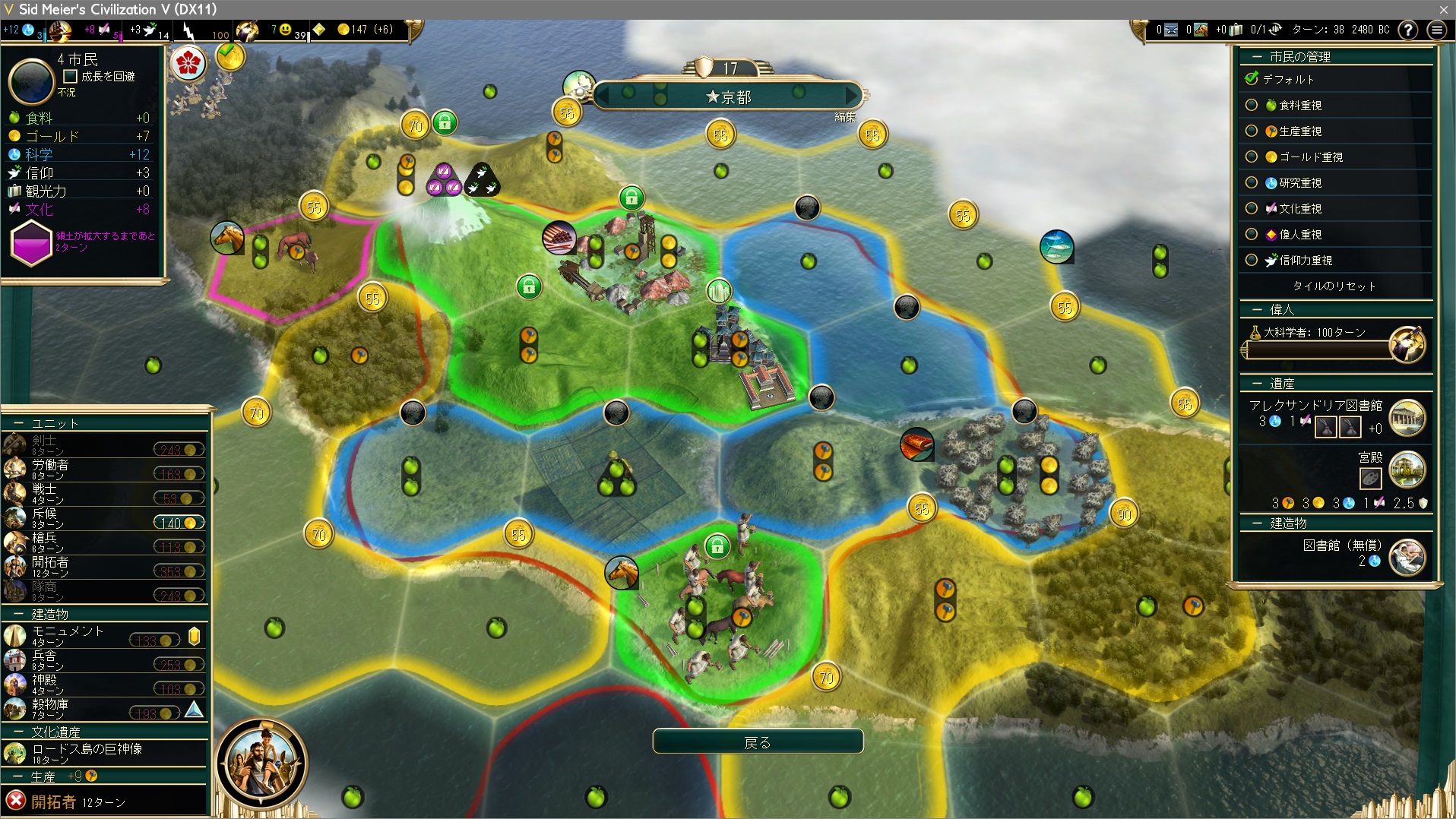 アレクサンドリア図書館とロードス島の巨神像を建てた以上、アポロ神殿は諦めるべきだ。世界遺産を欲張ると文明が停滞するし、アポロ神殿は幸福度のせいで4都市目を出せないから建てるのであって、そもそもそんなに強くない。