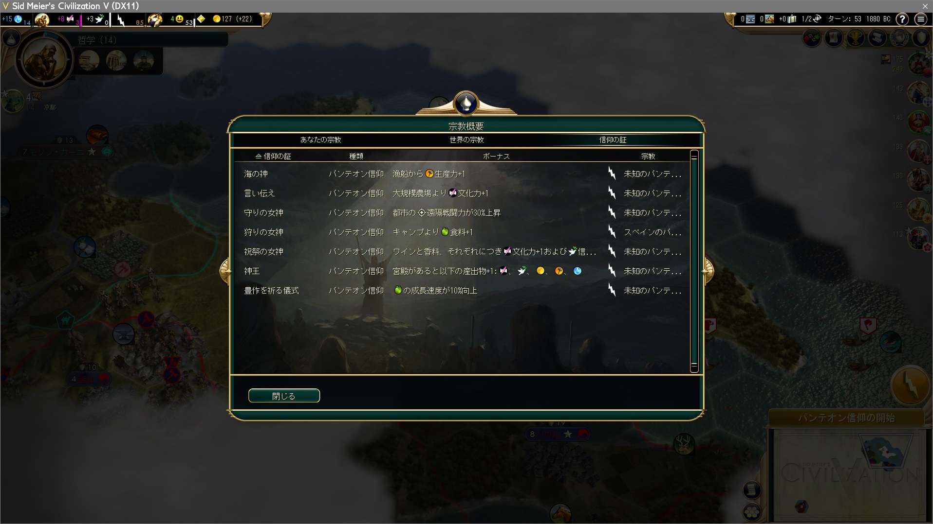 富士山で信仰力を稼ぎ、パンテオン開始。当然、自然との合一を選択して宗教創始を狙う。パンゲアと違って布教してもらえそうにないからな。