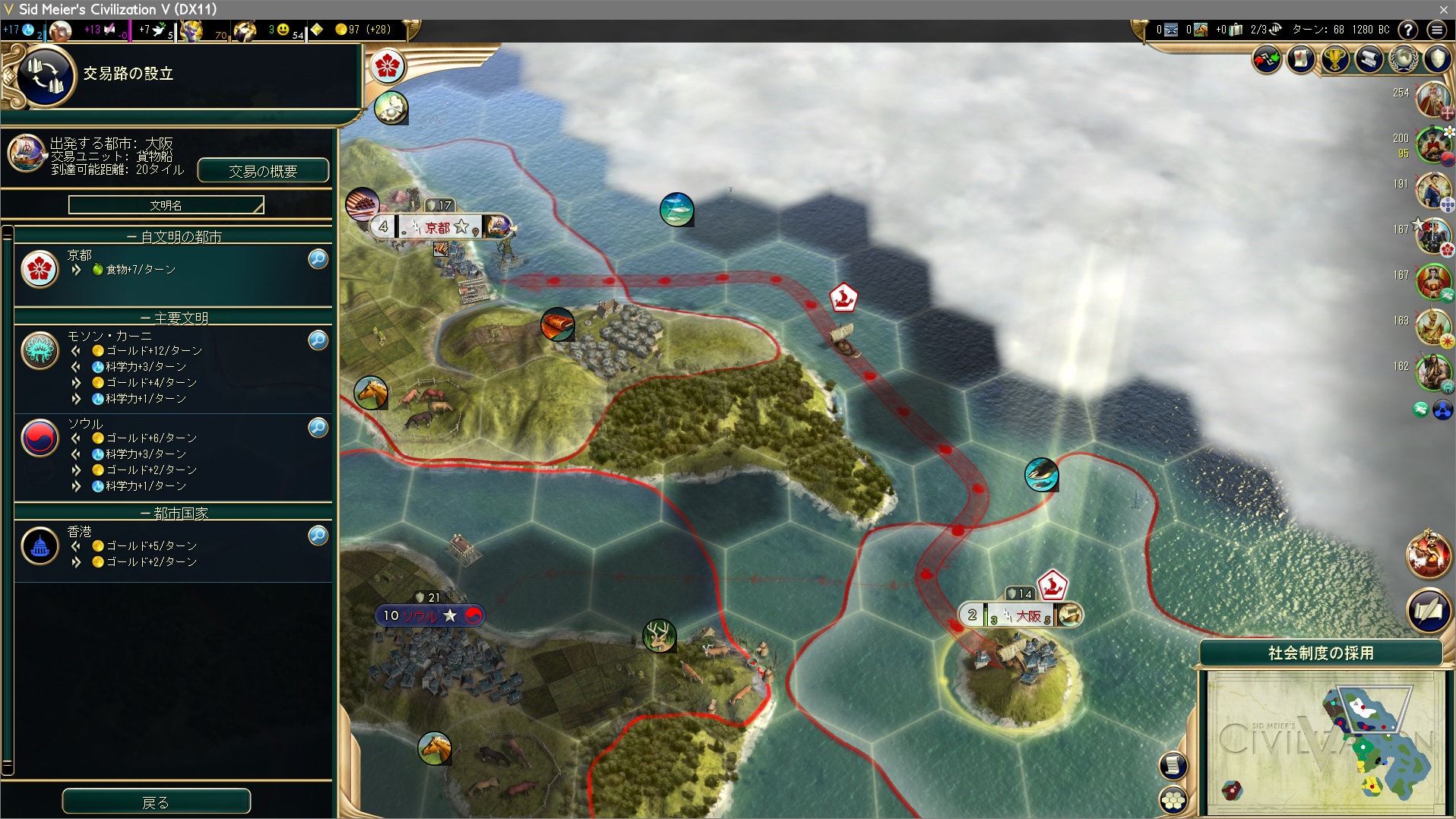 ターン67、ロードス島の巨神像完成。全世界マップは沿岸都市の首都もそう多くなく、十分狙えるだろう。