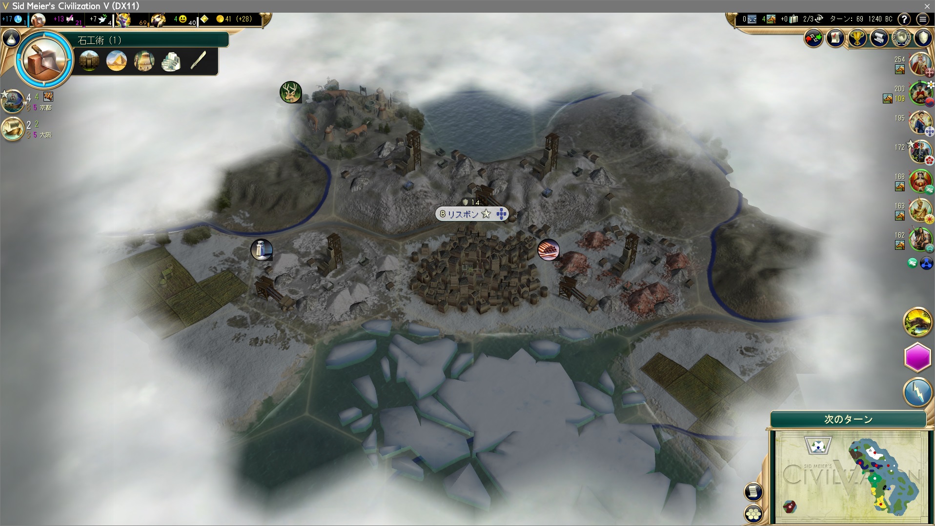 +7。ターン68で人口4というゴミ首都のキャッチアップを図る。