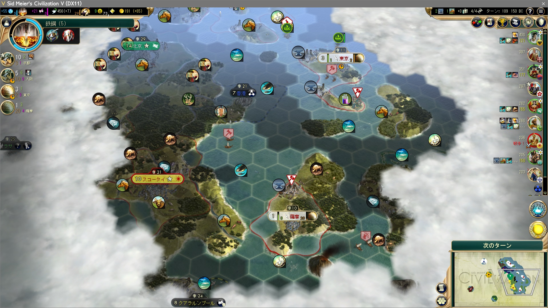 ターン110、スパイ配布。気持ち的にはルネ入り一番乗りの朝鮮にスパイをと行きたいが、ブチ切れて宣戦布告されると困る。なんだかんだで首都京都とソウルは5タイル先のご近所さんだし。