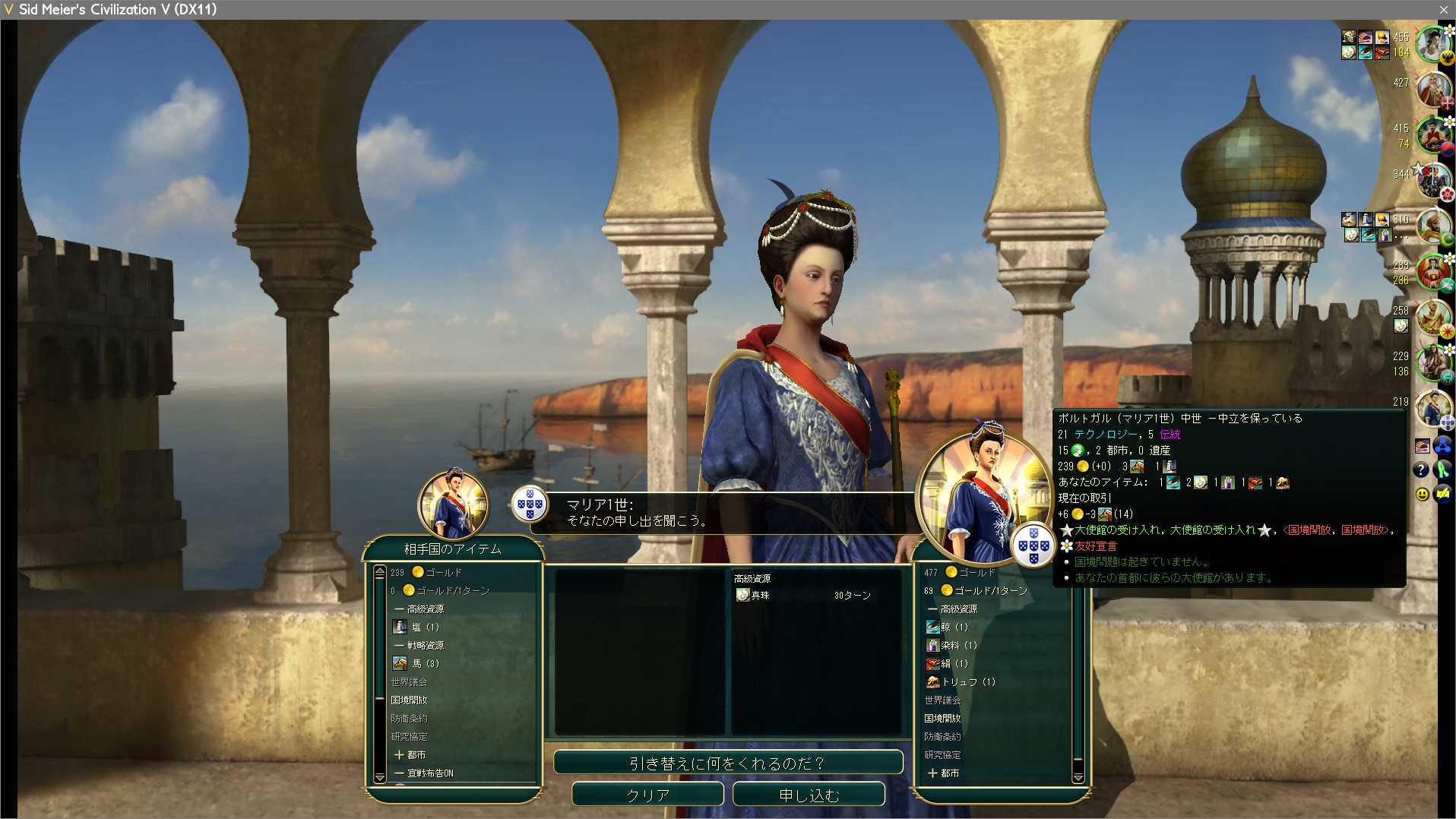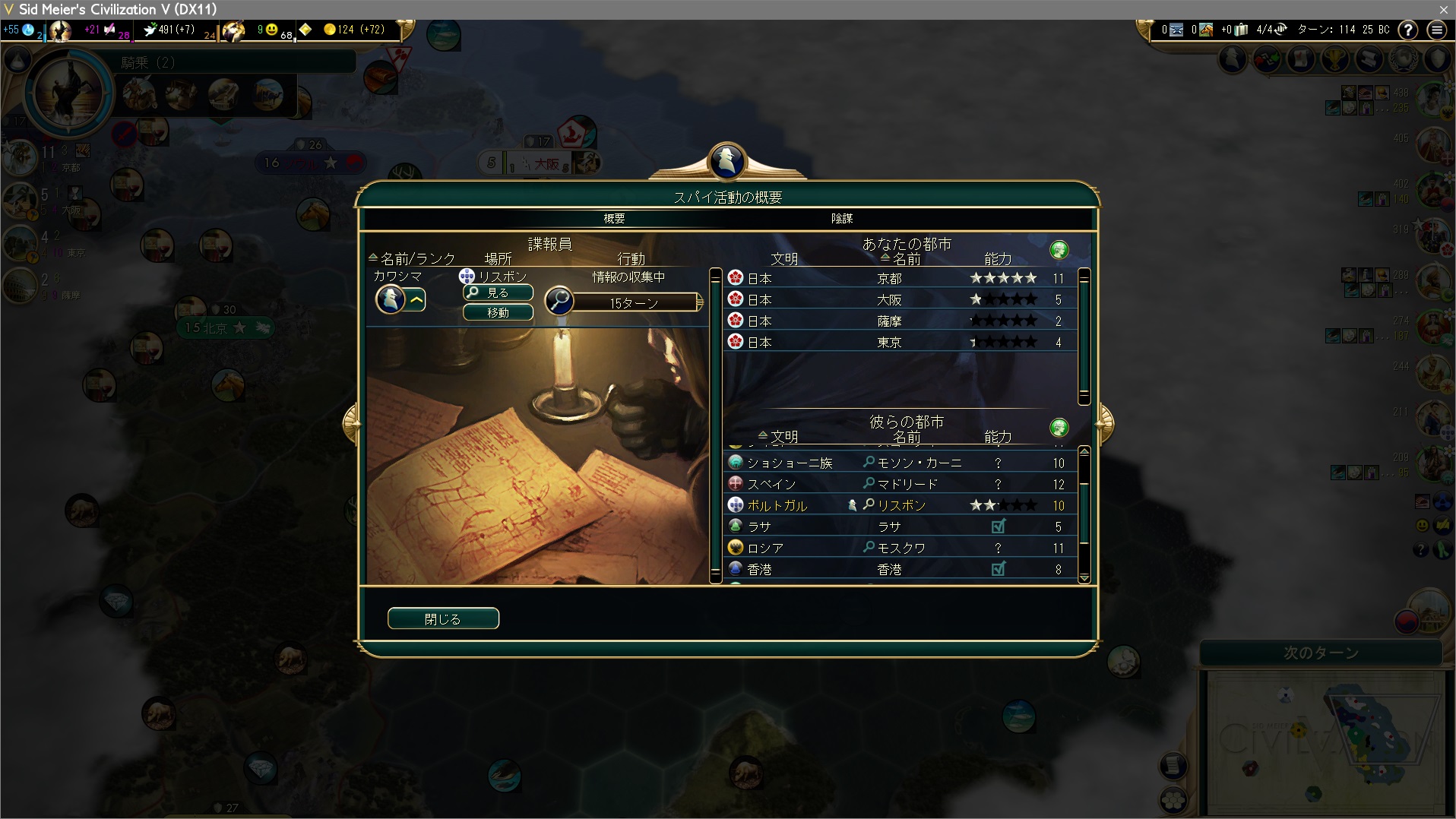 なので泣く泣くポルトガルにスパイ潜伏。必要ターンも15ターンと2倍はかかるが、まあしょうがない。こんな妥協、Civ4の暗黒時代に比べればヌルすぎるくらいだ。