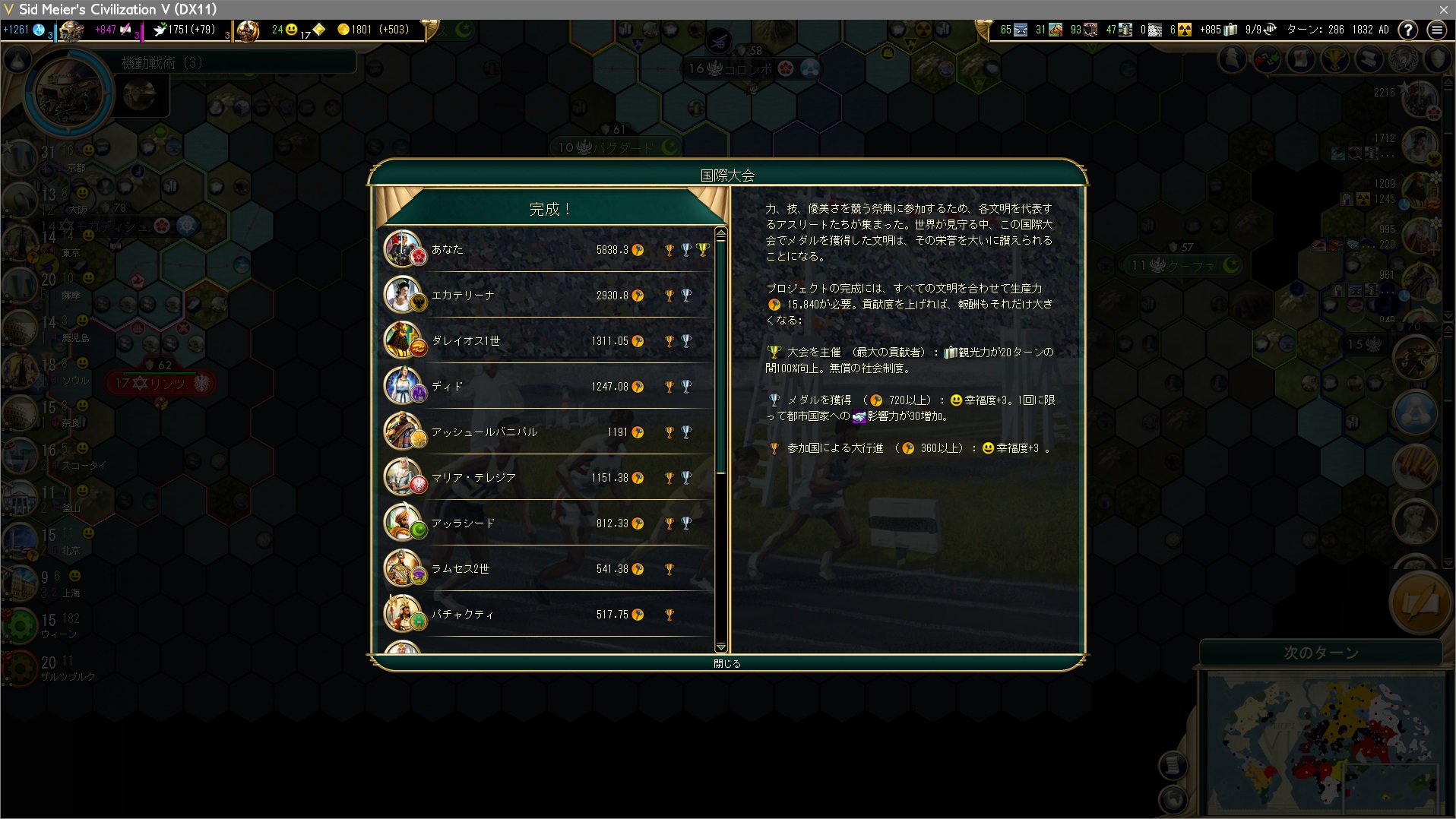 そういやASTK文化勝利プレイレポでは国際大会完成をうっかり忘れたまま勝っちゃったんだよな。今だから言えるが、あのプレイレポは少しばかり黒歴史だ。いや、ネタ要素がじゃなくてプレイングが。