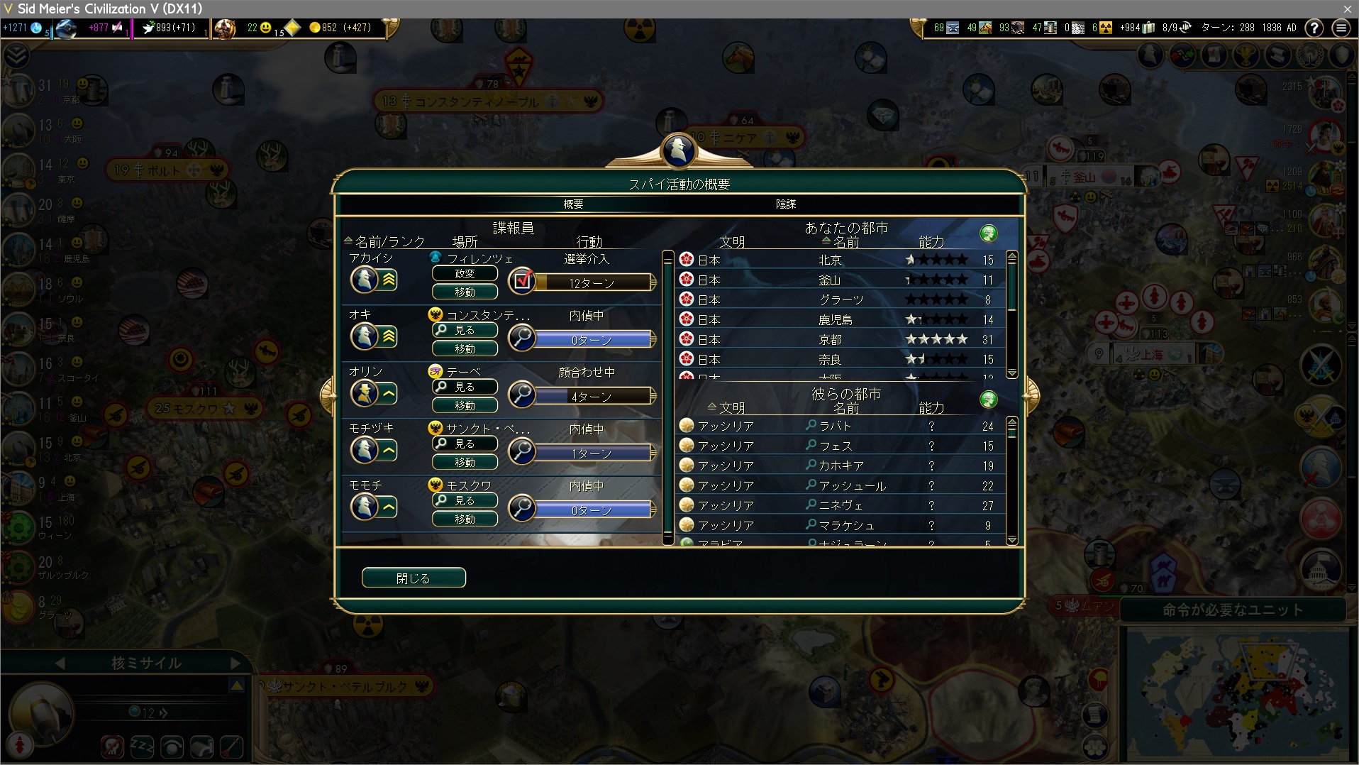 まず敵国の主要都市にスパイを潜伏させ、視界を確保する。核兵器のある都市は真っ先に核攻撃で潰さなきゃならねえ。