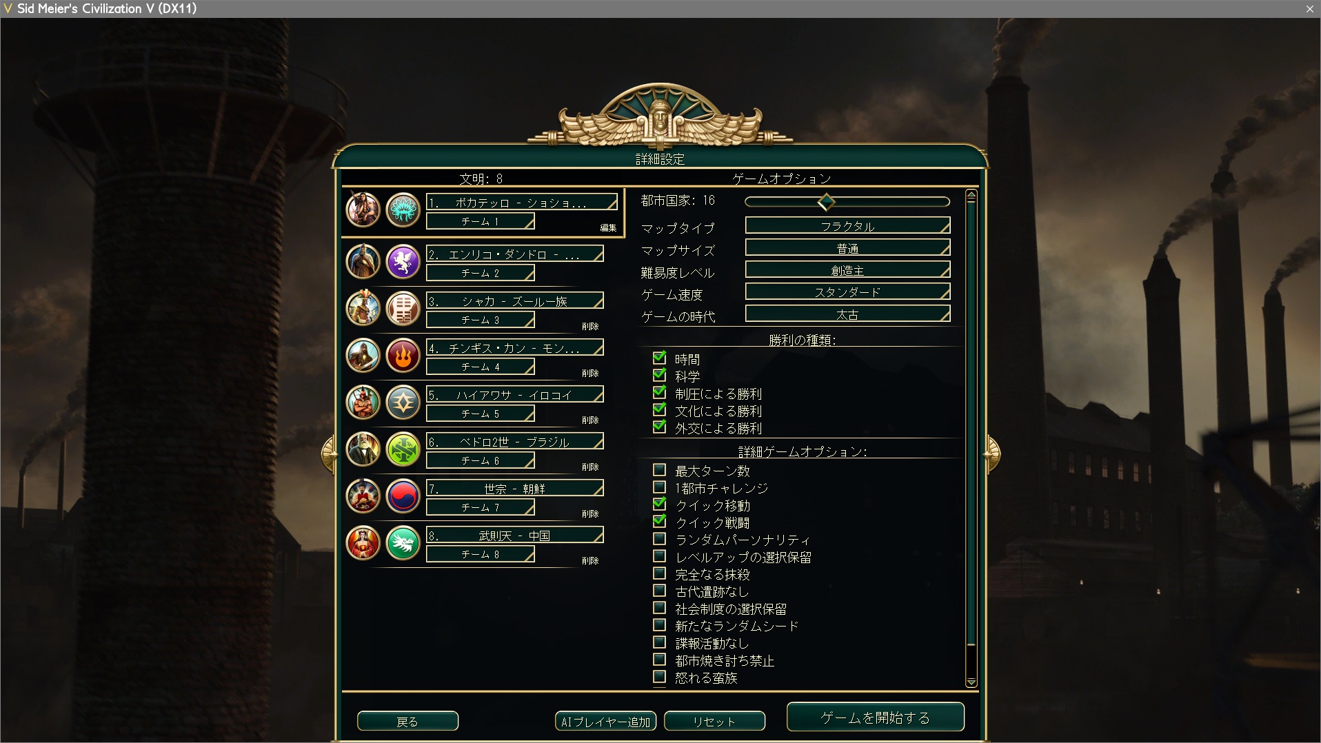 ショショーニ(プレイヤー)、ヴェネツィア、シャカ、モンゴル、イロコイ、ブラジル、朝鮮、中国。ホントの最強文明決定戦ならヴェネツィアoutギリシャin。