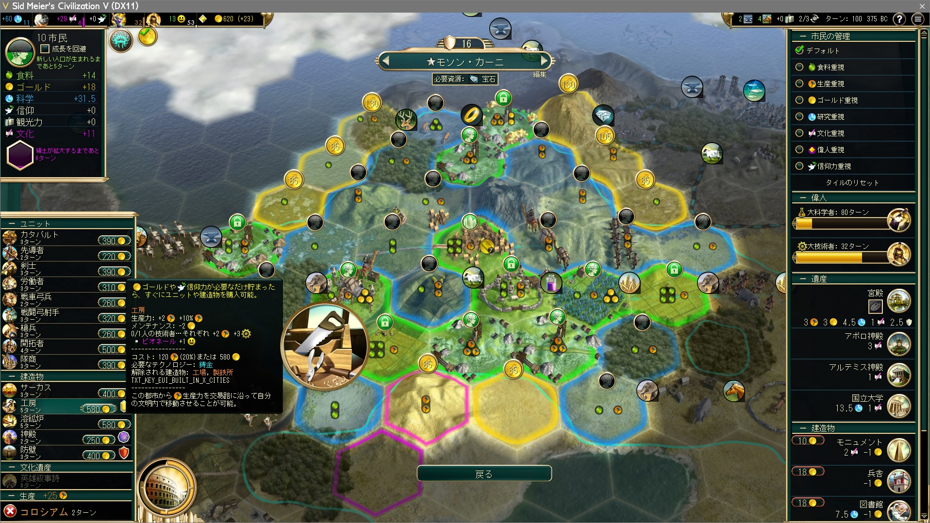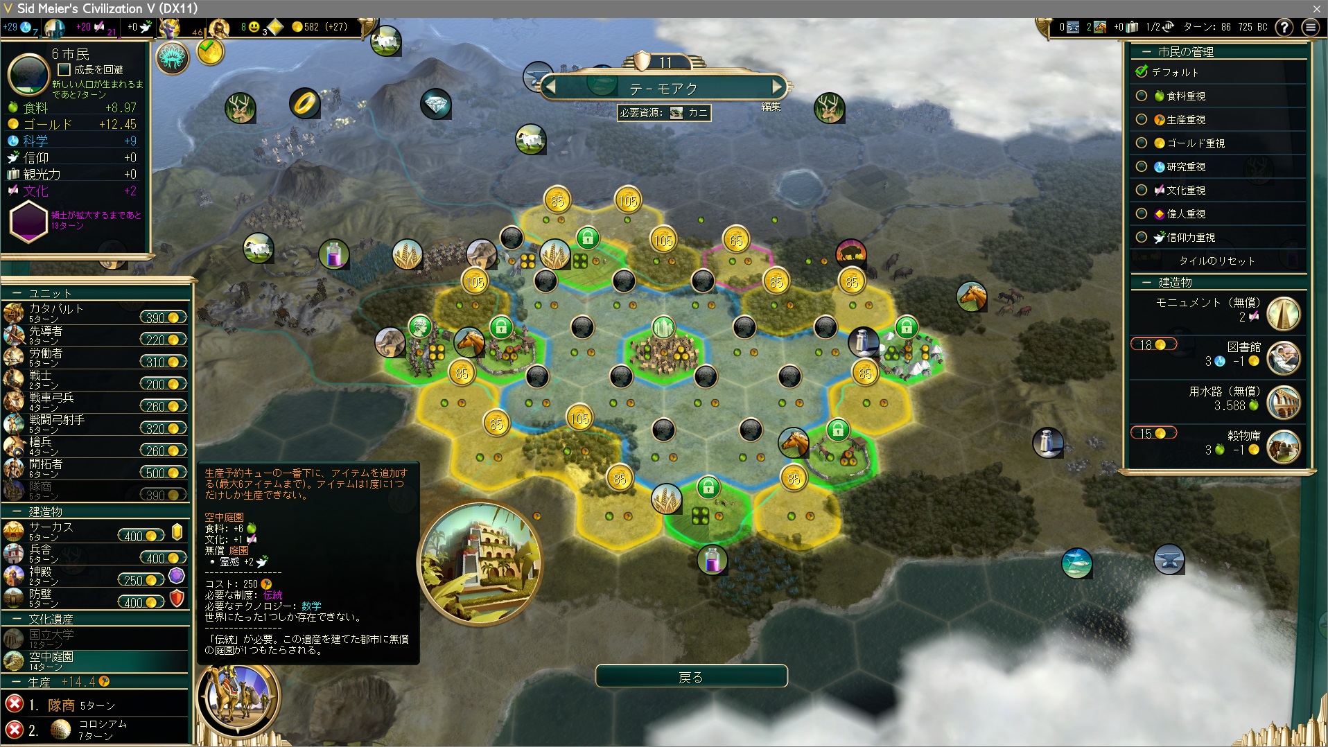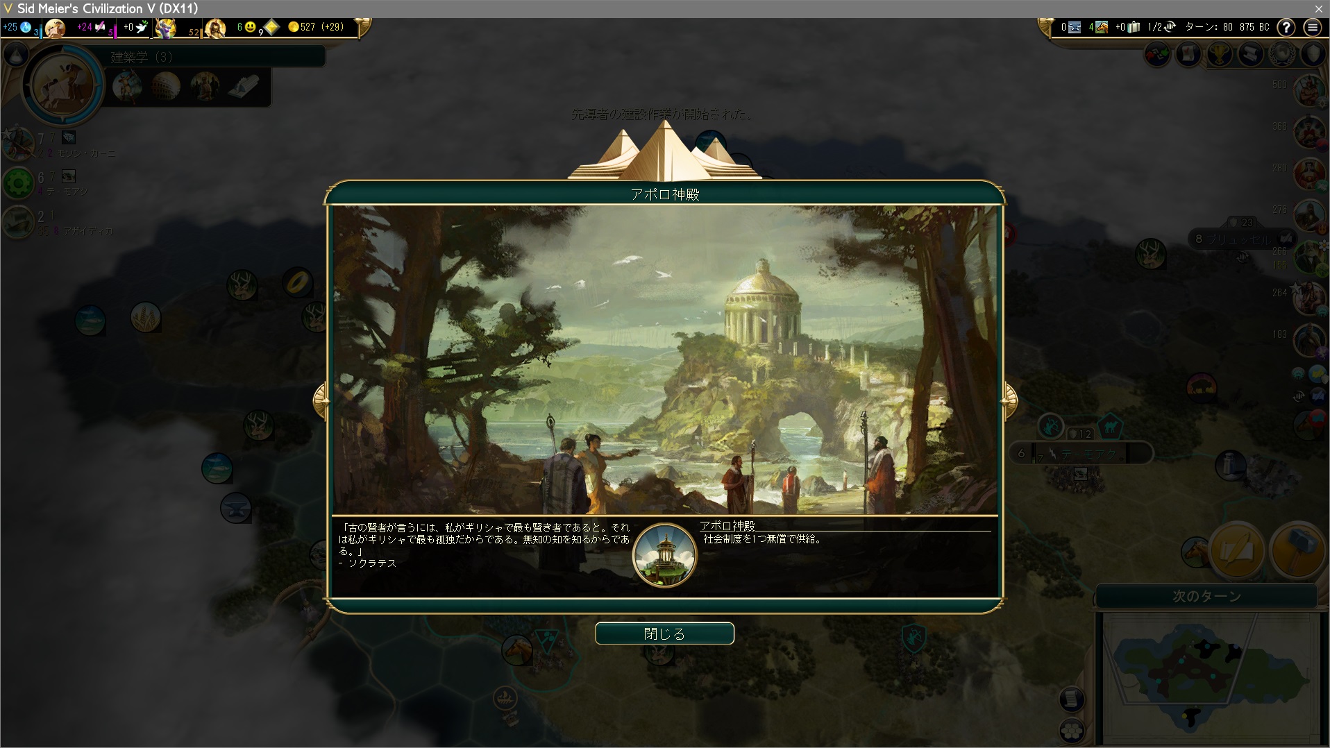 ターン80、アポロ神殿。海外交易路からビーカーを得られないので研究は遅れたが、神々を讃えるモニュメントがあるのでなんとか間に合った。