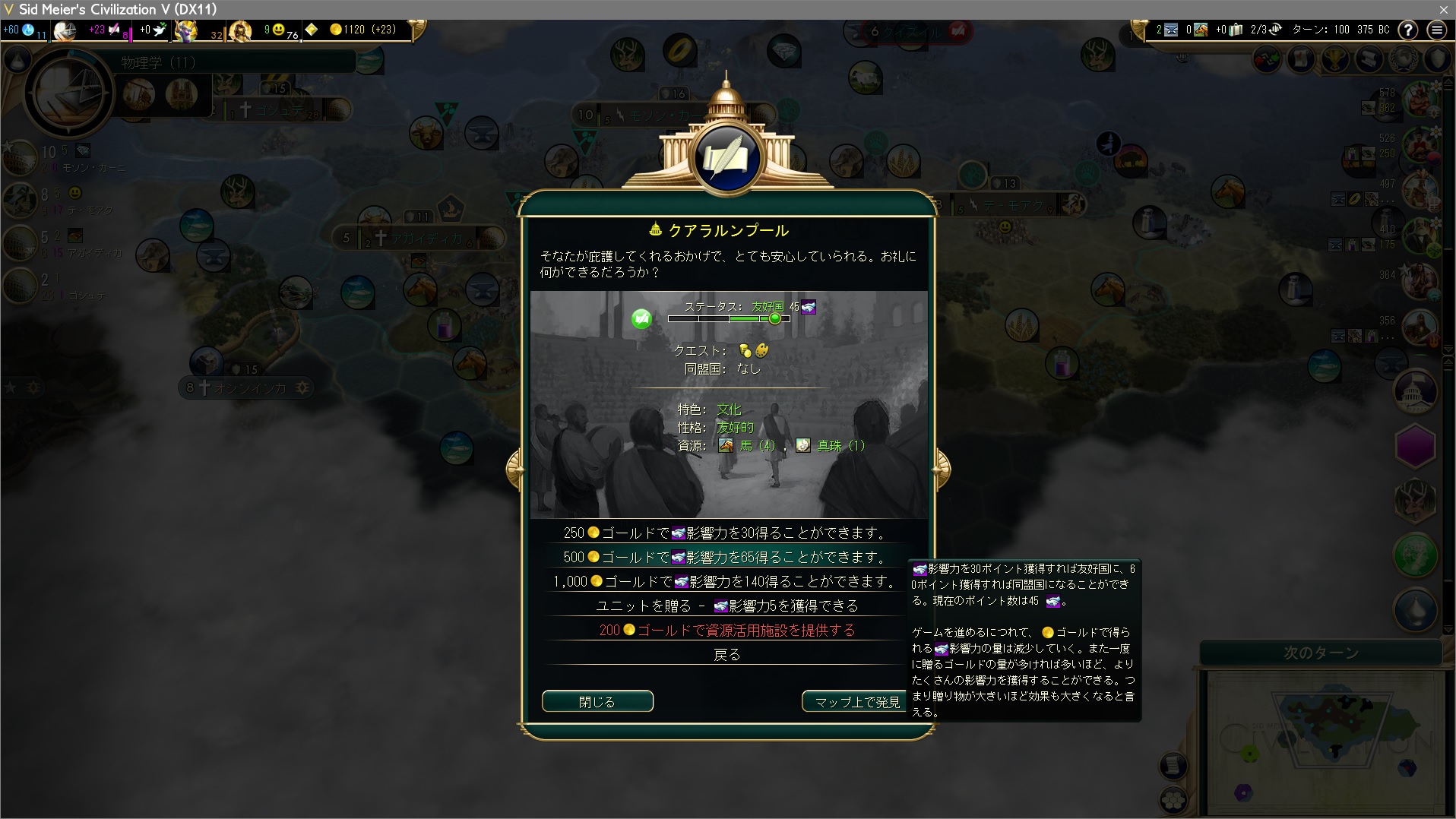 今まであまりやって見せなかったが、序盤から都市国家にゴールドを貢ぐのもアリ。ただし都市国家ボーナスが2倍になる中世入りを待ってから。宗教創始狙いでの宗教都市国家との同盟なら太古・古典でもOK。