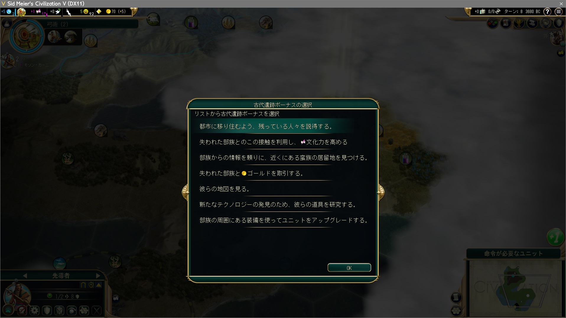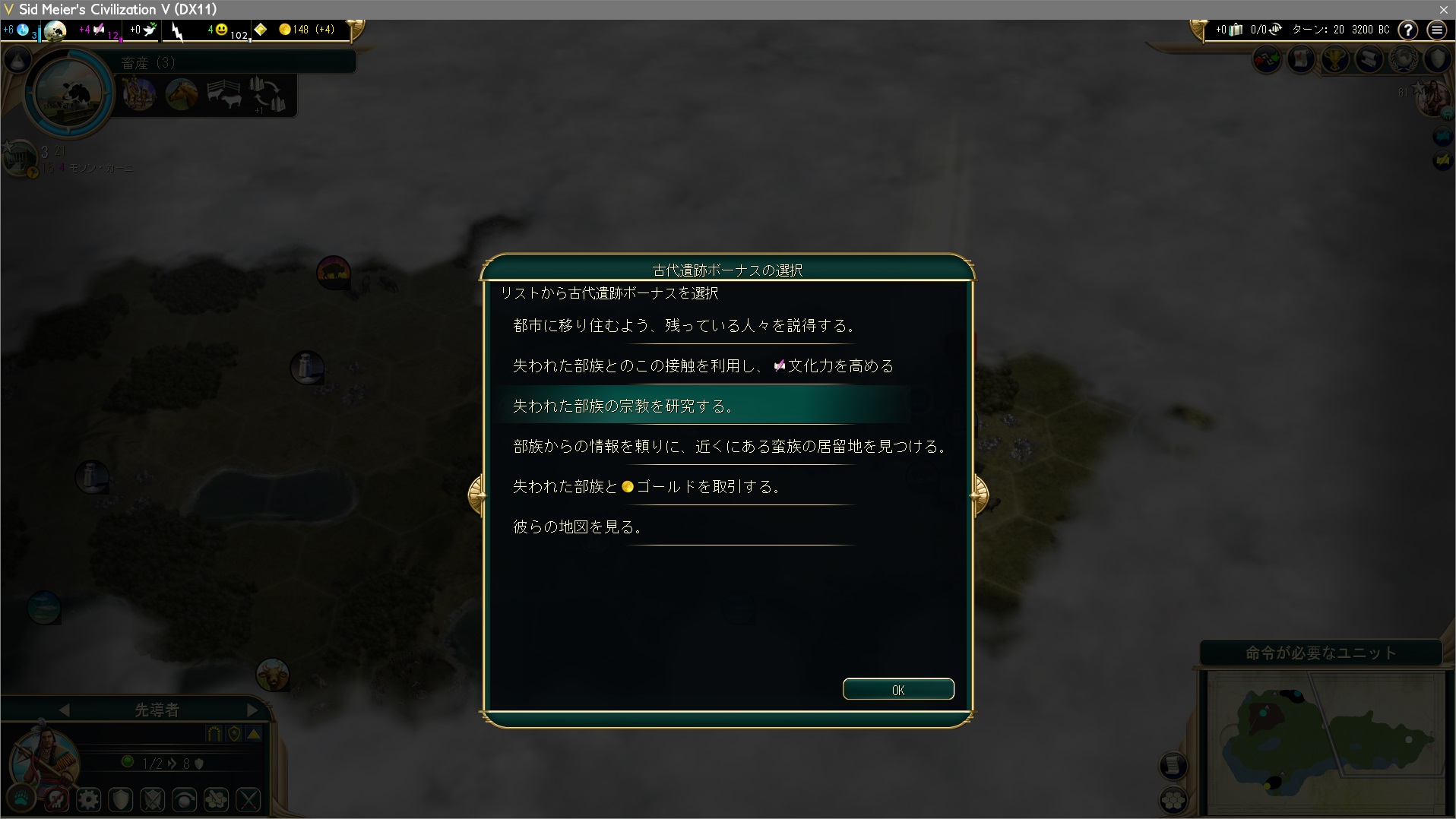 ショショーニUU先導者で古代遺跡を踏む。好きな古代遺跡ボーナスを選べるぞ。オレ流、文明・指導者評価にテンプレは書いておいたが、首都の立地や狙う世界遺産なんかでケースバイケースなチョイスを。