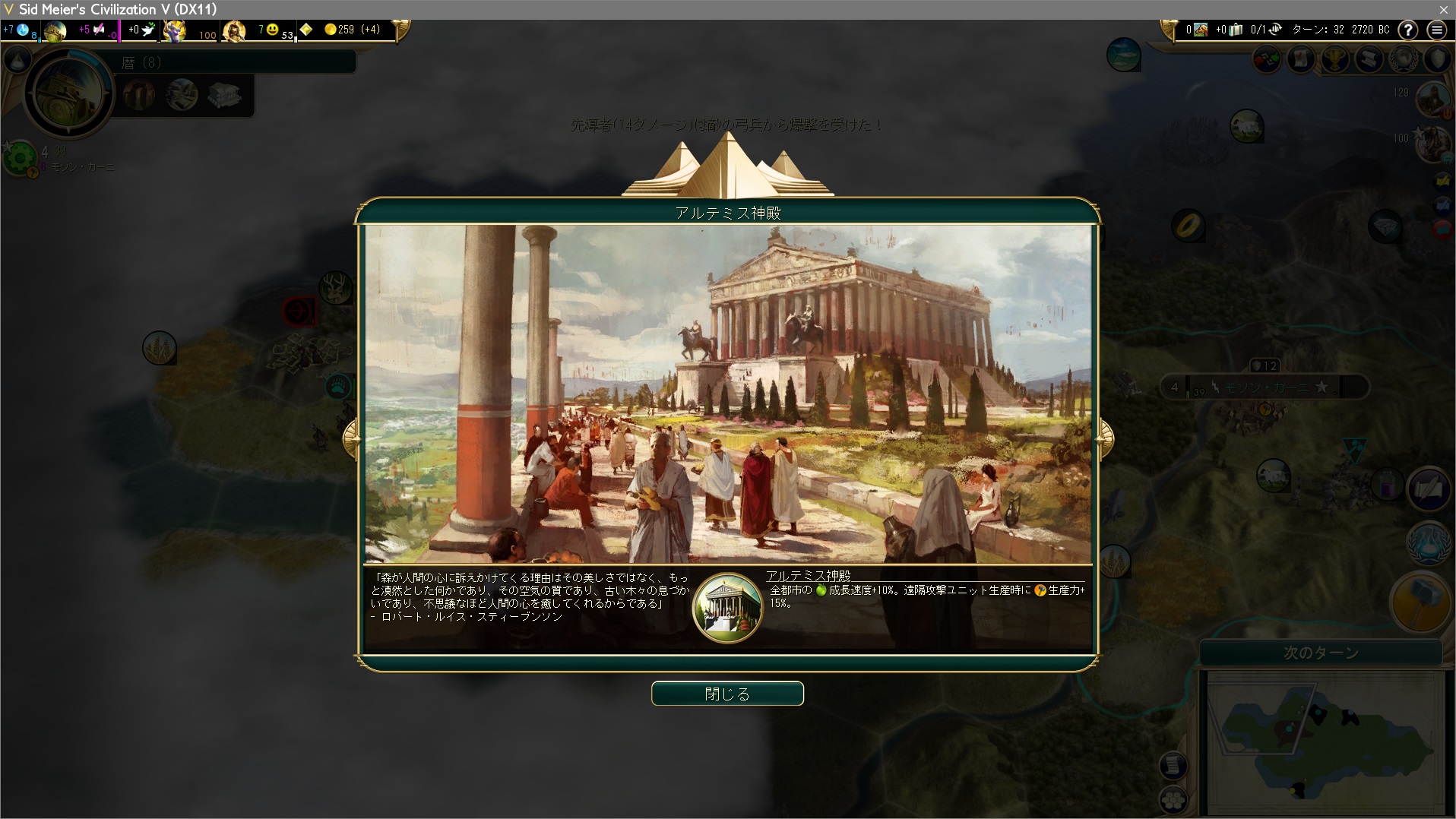 生産は、先導者→先導者→アルテミス神殿。これで立地が良ければ40ターン以内にアルテミス神殿が完成する。40ターン以内ならアルテミス神殿は8割方建つはず。