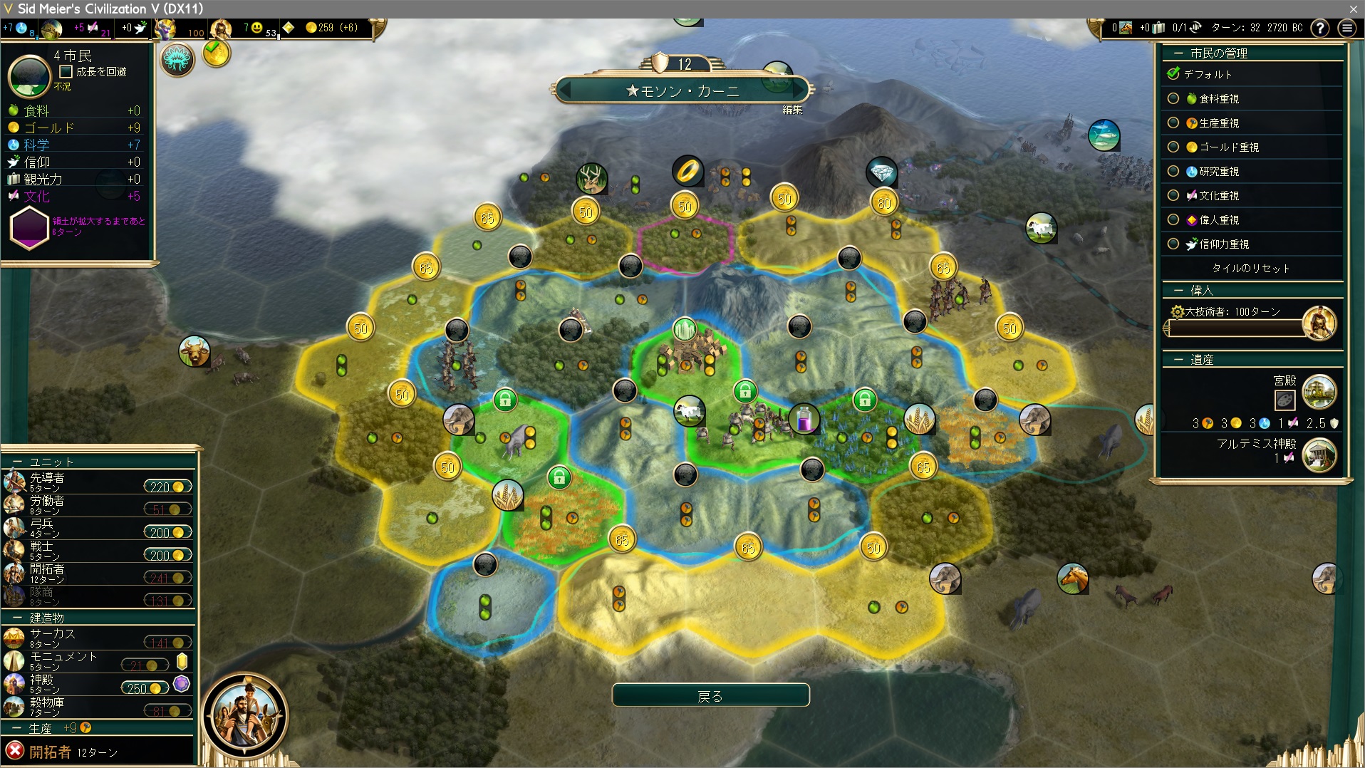 アルテミス神殿の次は開拓者。初心者向けプレイレポで言い忘れていたのだが、開拓者は都市の人口が成長してからつくろう。