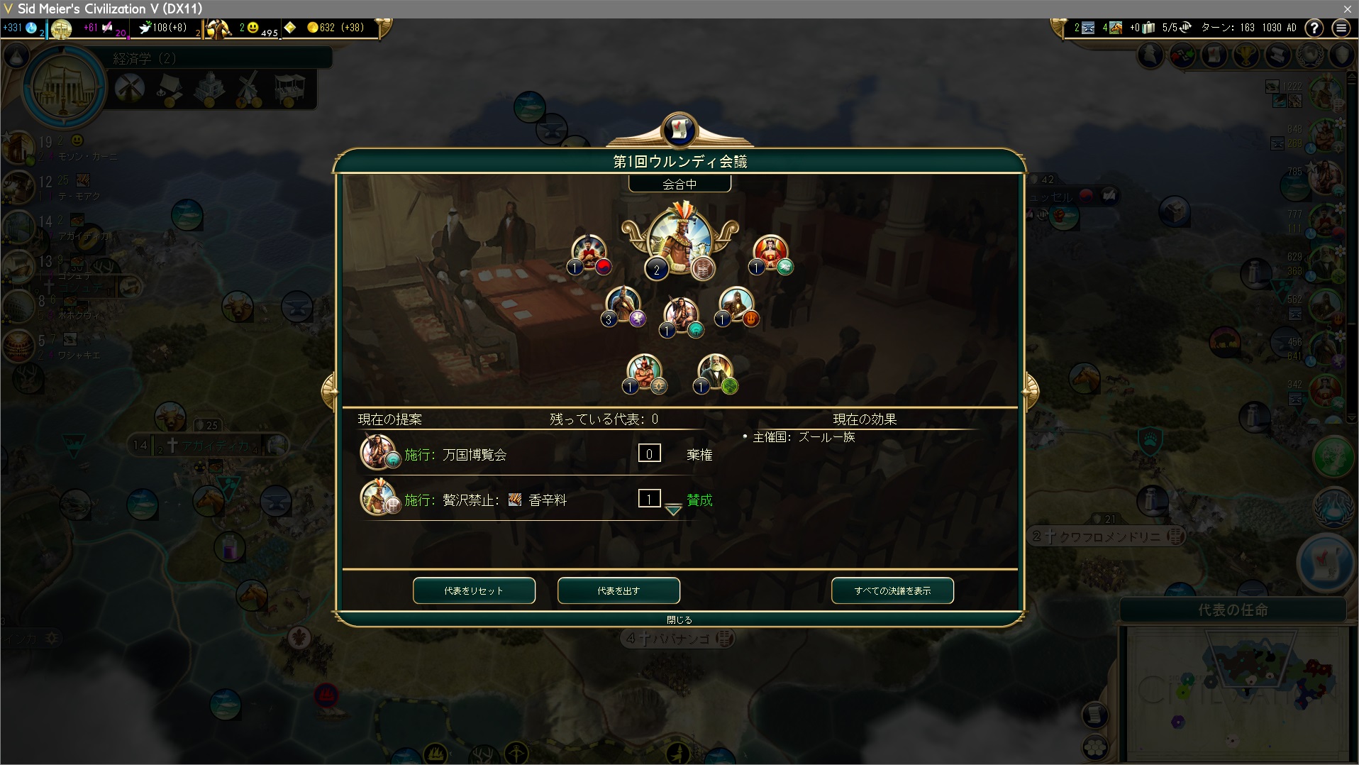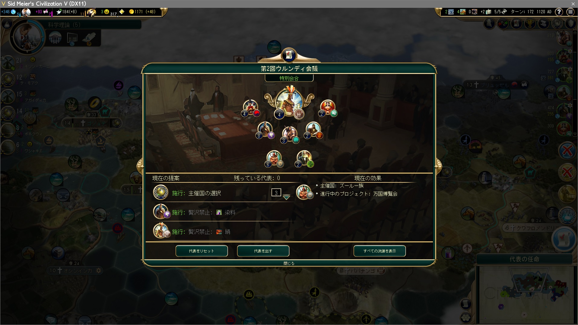 世界議会が産業時代入り、主催国の選択。プレイヤー3票、ヴェネツィア8票。