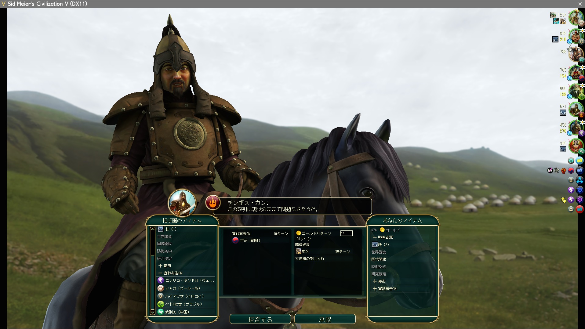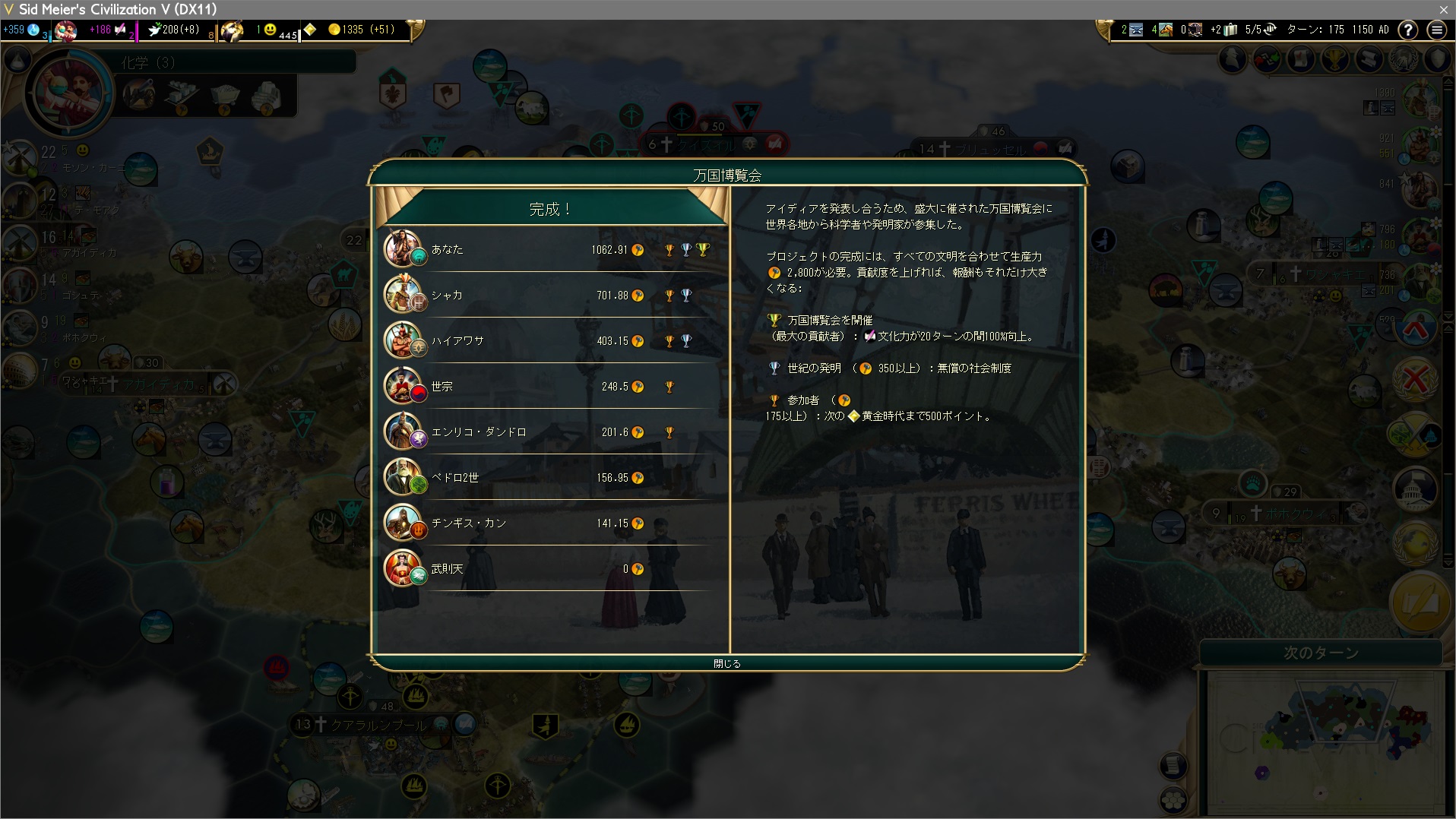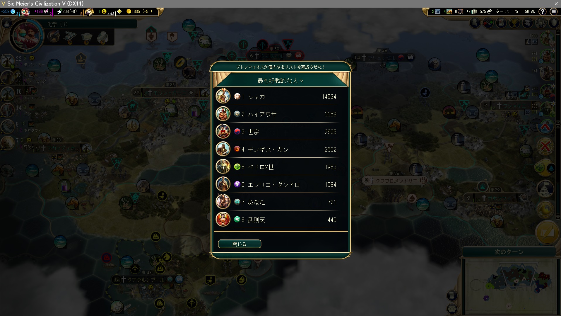 14 / ターン払ってモンゴル→朝鮮の宣戦依頼。これで全文明が戦争状態になったので金賞はイタダキだ。