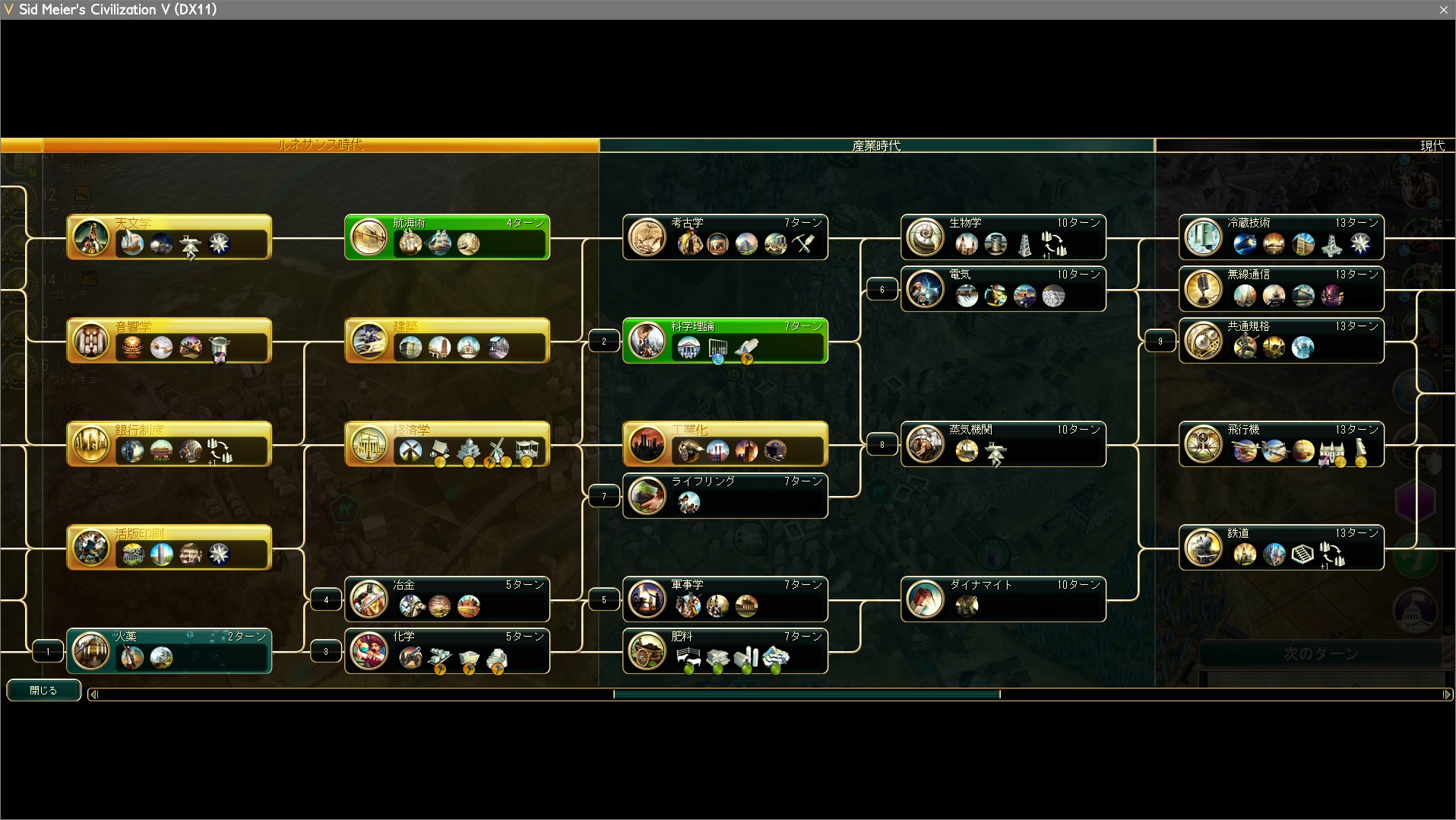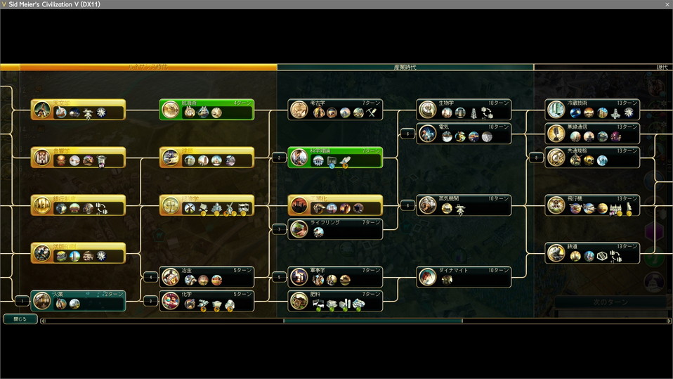 工業化で産業時代入り。化学はスパイで盗むため、火薬→科学理論→冶金→軍事学→…→共通規格→プラスチック、と進める。