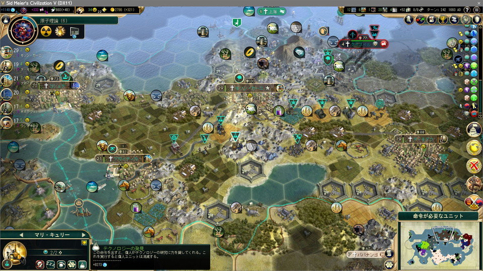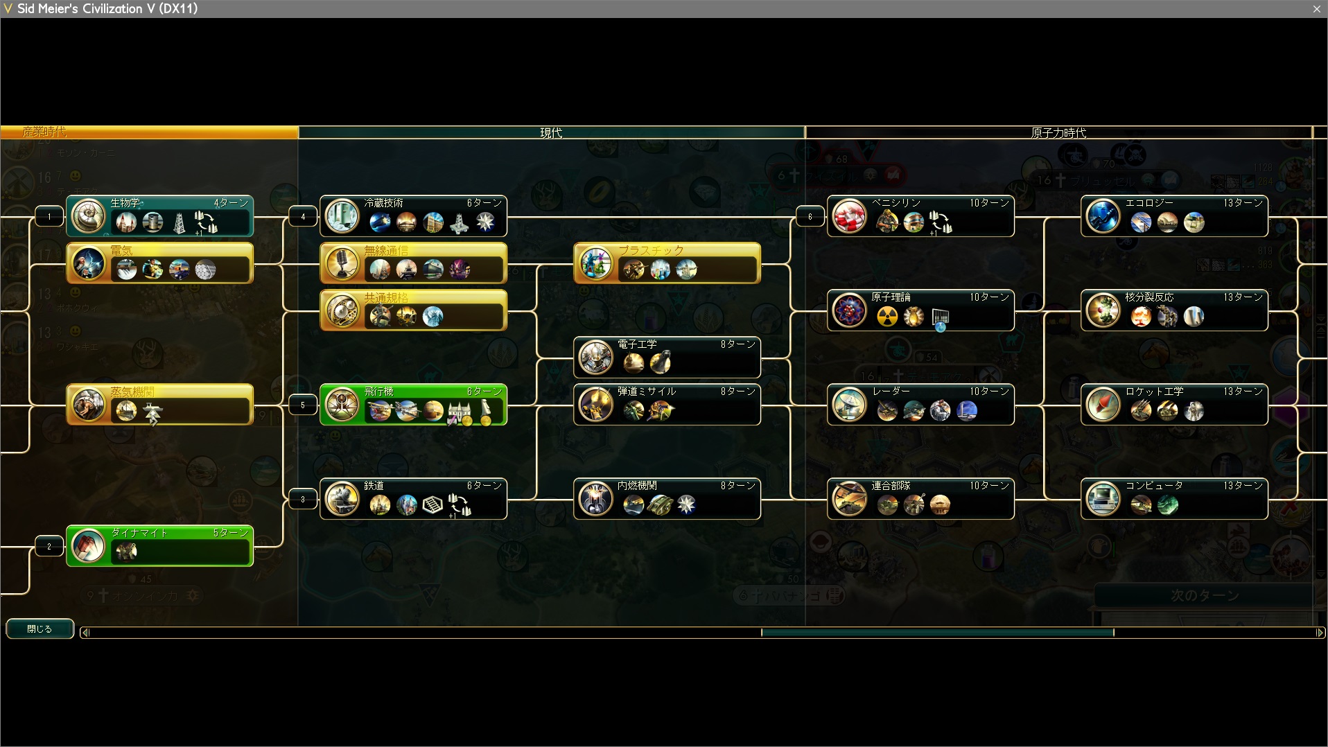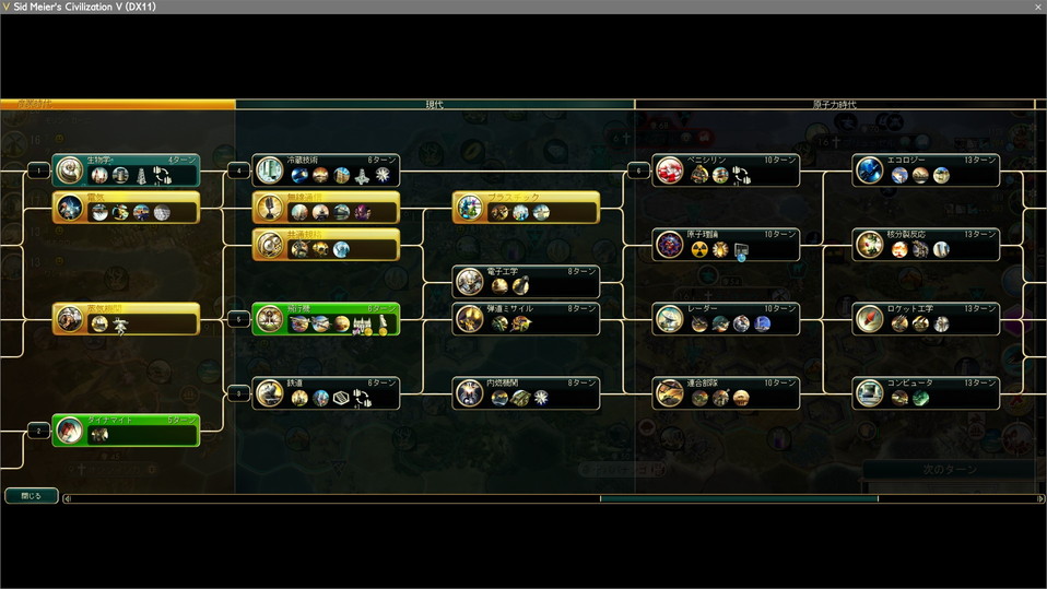 プラスチックを獲得。狙いは条約機構を使った外交勝利なので、交易路数を増やしたい。よって生物学、鉄道、ペニシリンを急ぐ。