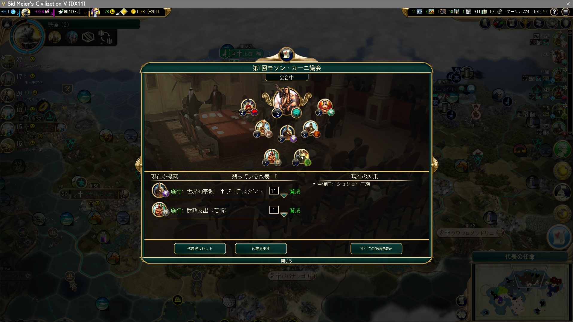 もう片方の決議は財政支出(芸術)。これが提出されたから科学勝利を諦め外交勝利狙いの方針を立てたのだが、意外にも否決される。