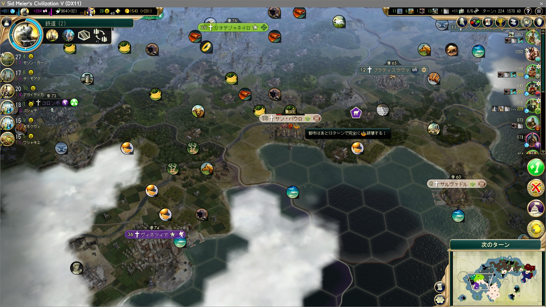 思想圧力の壁、ブラジルの都市サン・パウロがシャカに奪われ、ブラジル残り1都市に。ブラジルが滅亡してしまうともう文明中、不満まみれや。