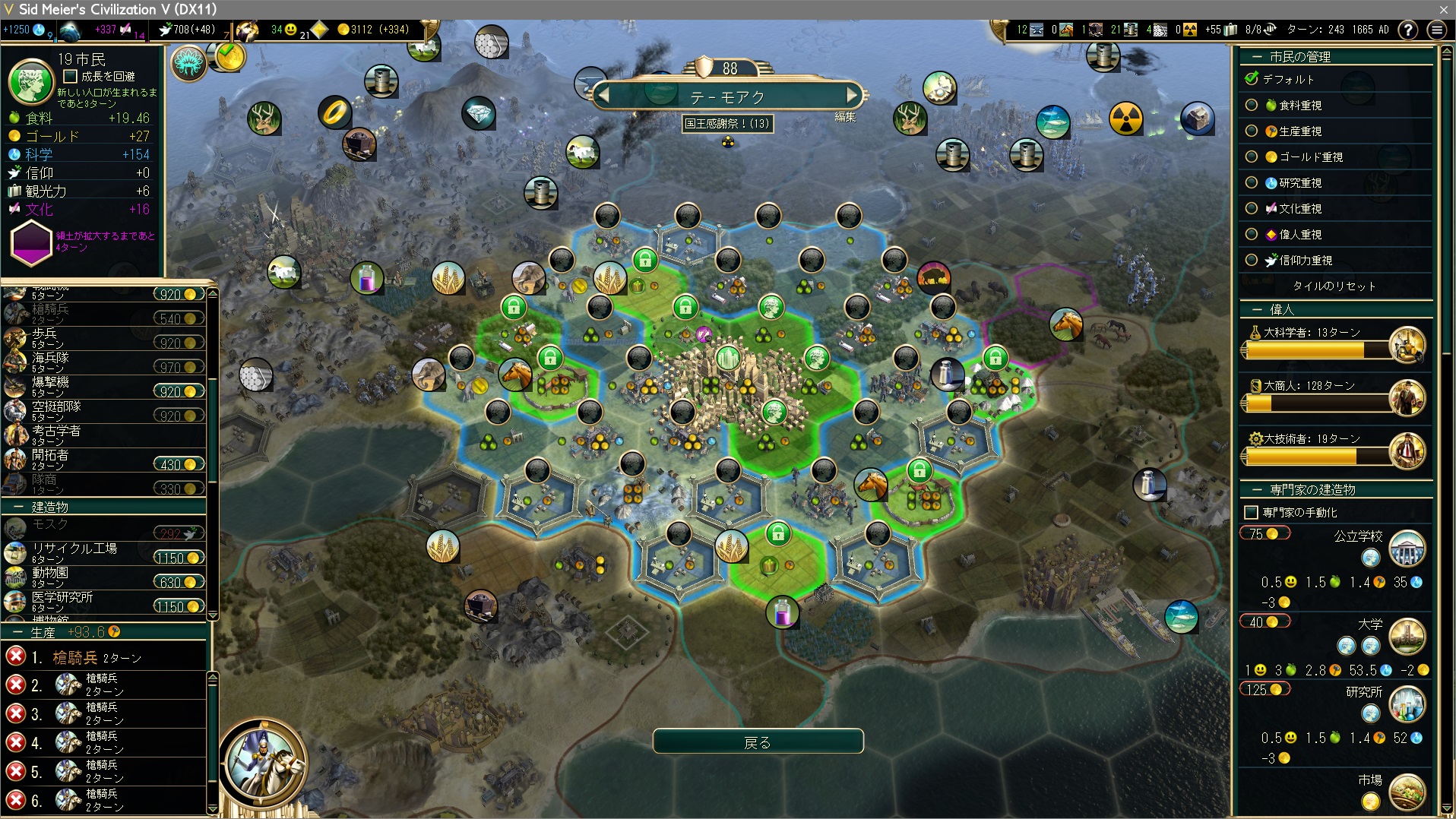 外交勝利にあまりハンマーは必要ないのだが、役に立たないわけではない。もちろん都市でゴールド生産するのではなく、民主主義の兵器廠を使う。