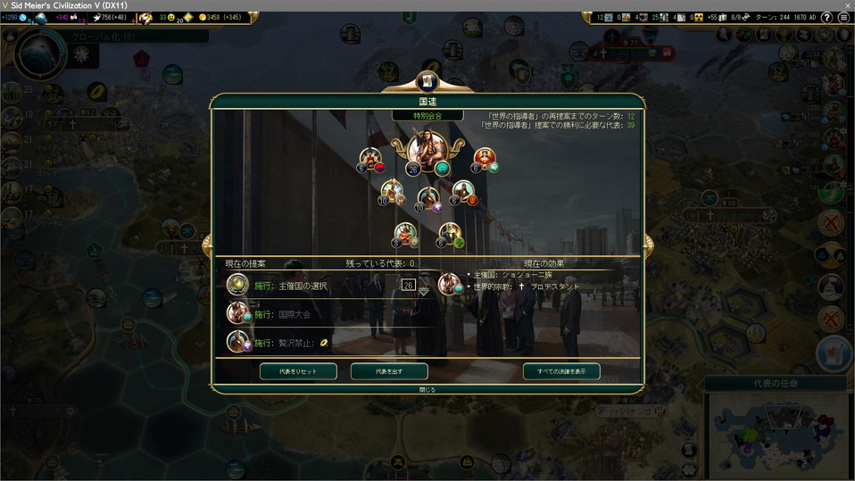 外交勝利に必要な票数は39票、現在ショショーニは26票なのでまだまだ足りない。あと10ターンで13票を集めなければ。