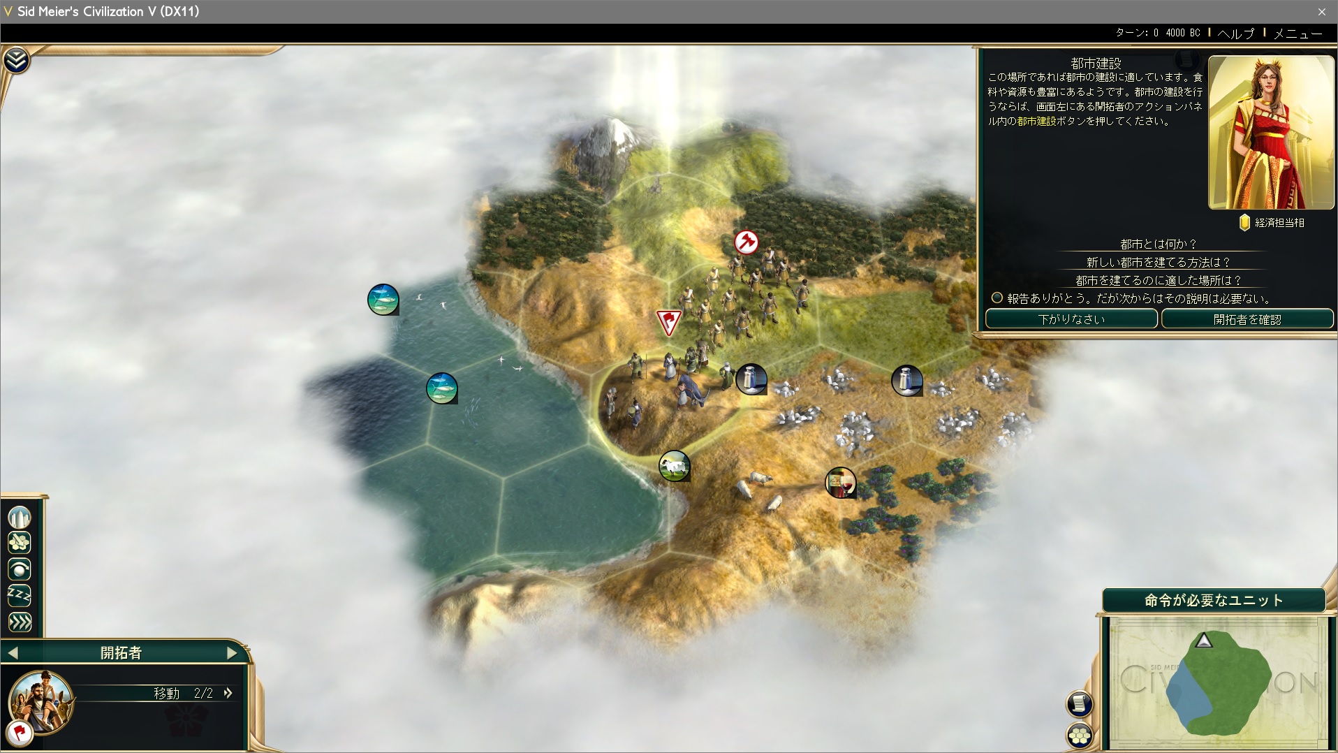 ターン0(BC4000)が終了し、ターン1(BC3960)が始まる。なんと1ターン経過するだけで40年も経過しているのだが、ゲームにはほとんど関係ない。引き続きユニットを動かしてターンを終了を繰り返そう。