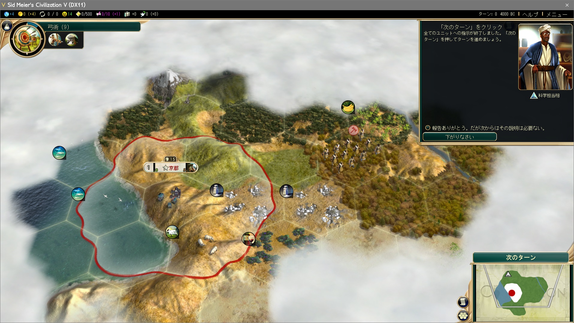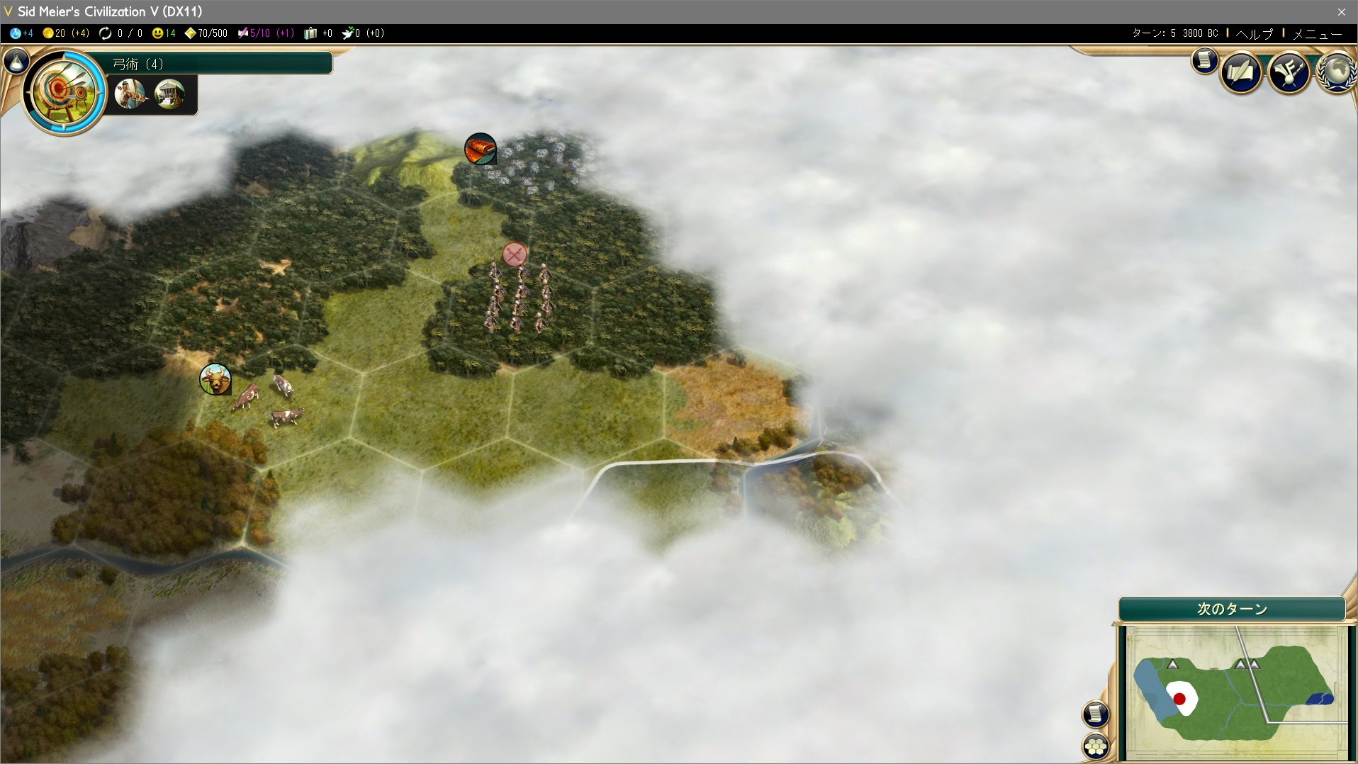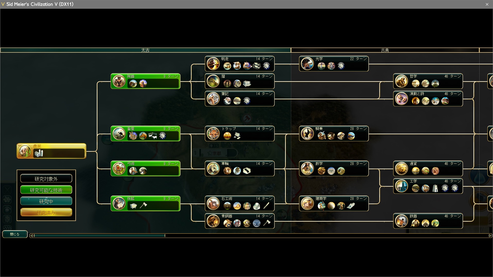 初心者の内はよくわからないと思うので、今回はとりあえず弓術を選択してみよう。人民が飛び道具の概念を理解し、弓兵が生産できるようになる。
