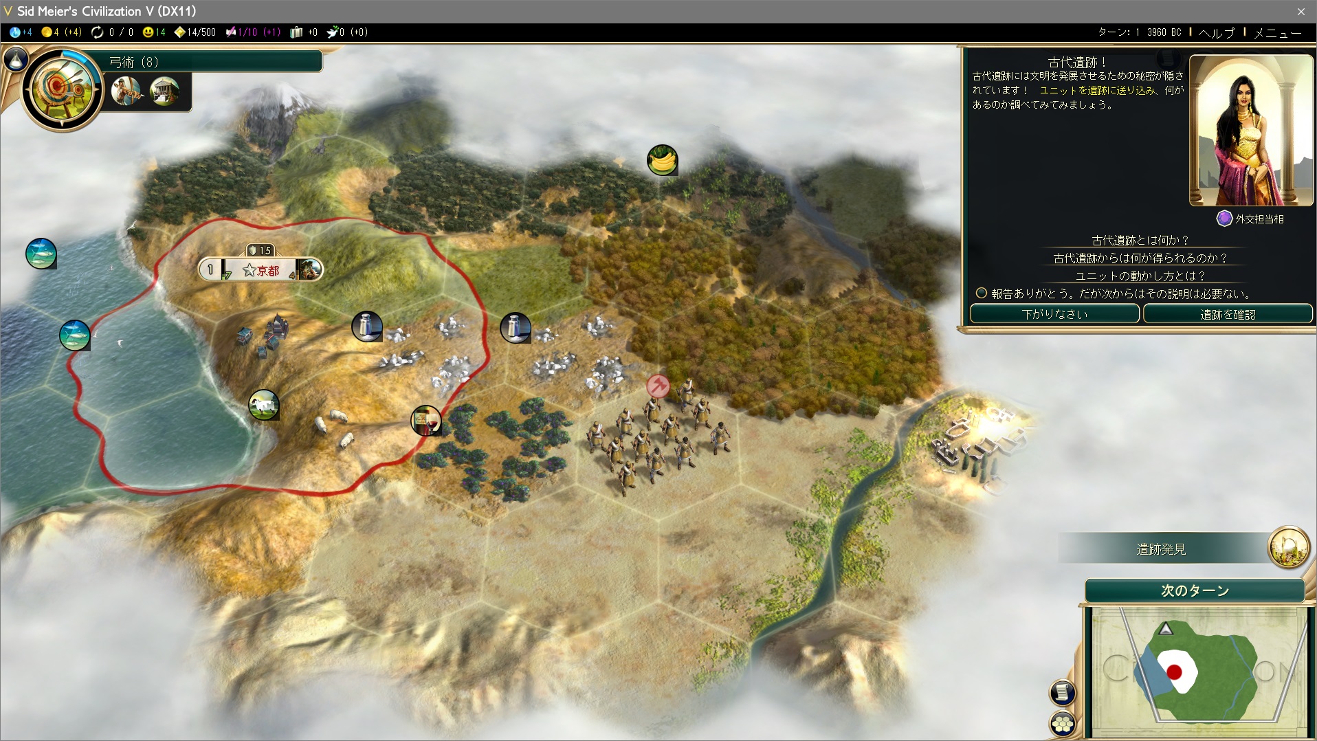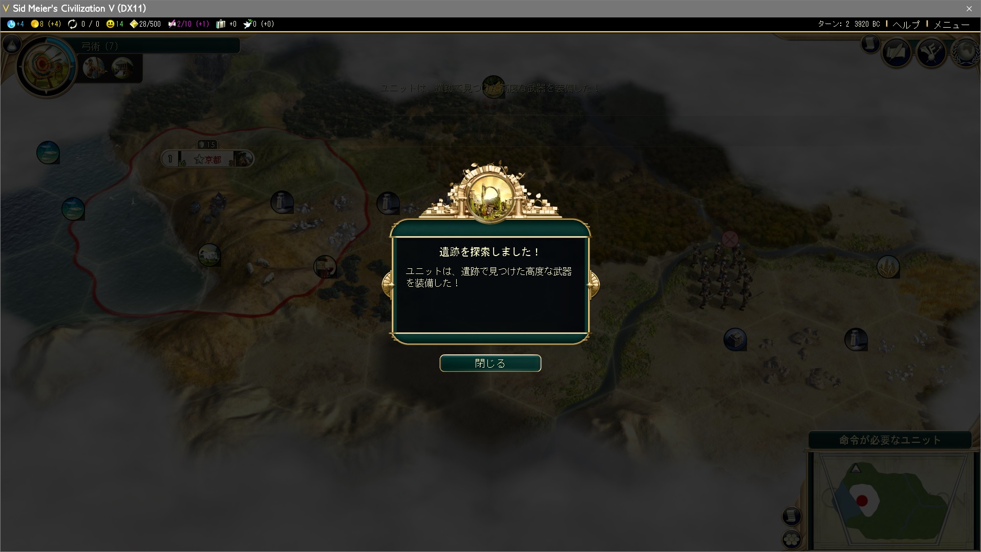 古代遺跡を発見した。古代遺跡にユニットが入ると様々な恩恵がもたらされる。戦士で入ってみると、