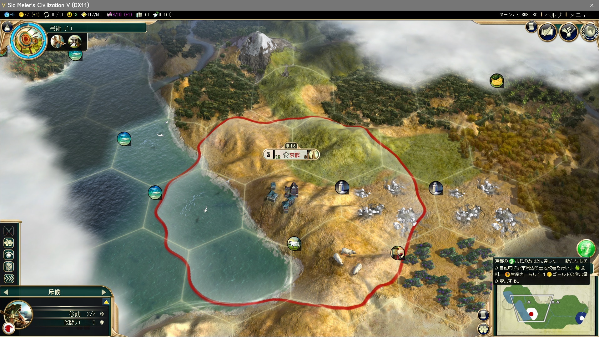 画面右のポップアップと首都:京都をよく見てほしい。人口が1→2に増えたのがわかる。人口が増えれば増えるほど都市は大きくなり、強くなるとわかるだけでいい。