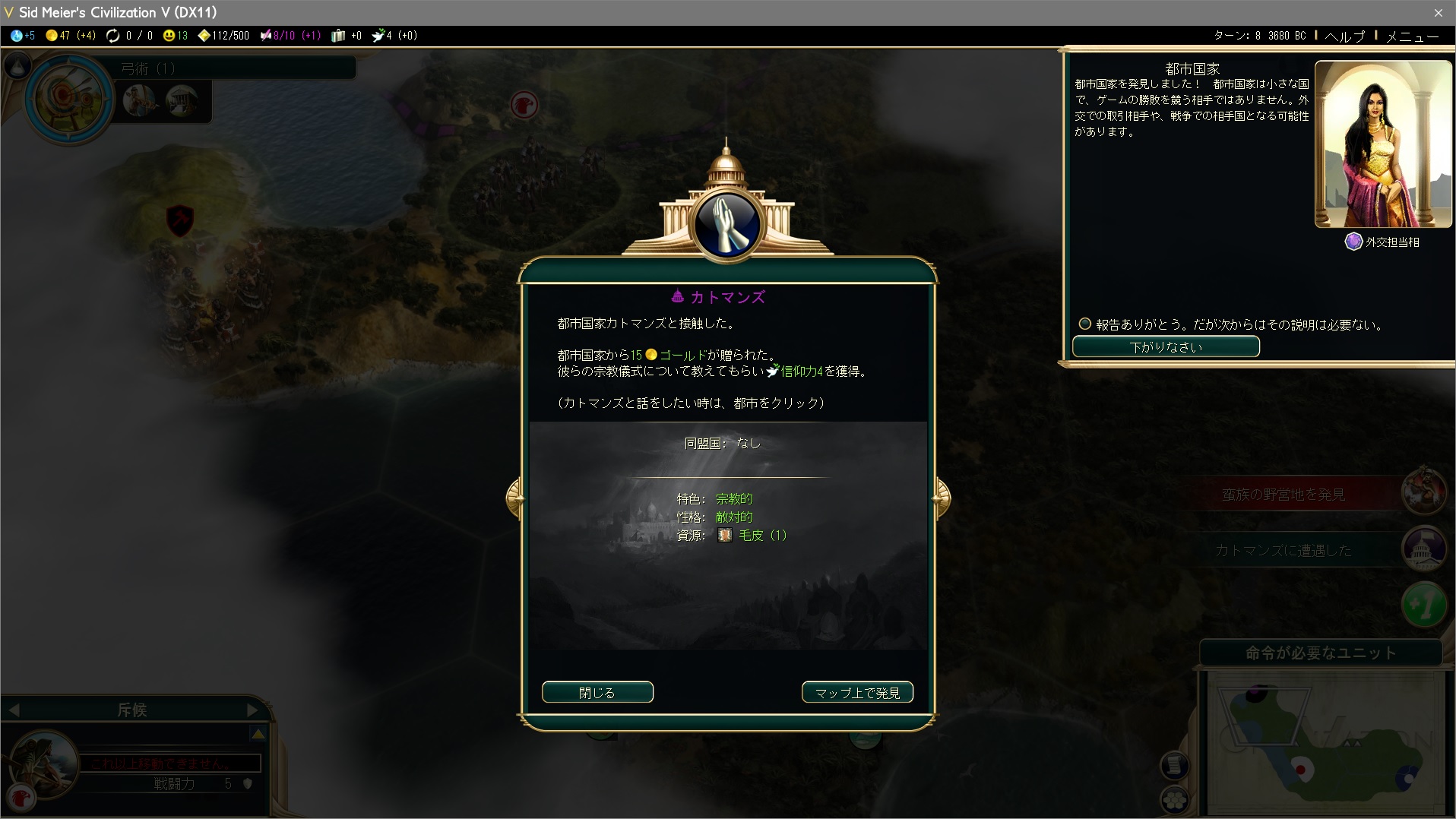 2つ目の都市国家と遭遇。都市国家には文化、宗教、海洋、軍事、商業という属性があるのだが、宗教系都市国家からは