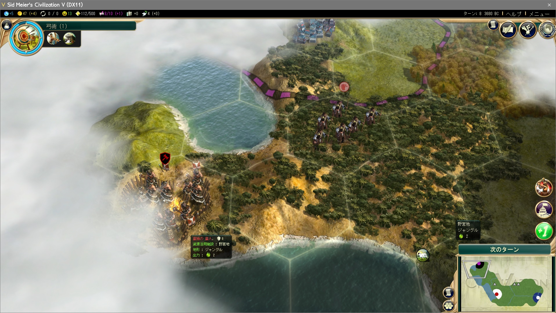 弓術の研究が完了。以降、都市で弓兵がつくれるようになる。いいよなぁ、飛び道具ってぇのはよぉ!!