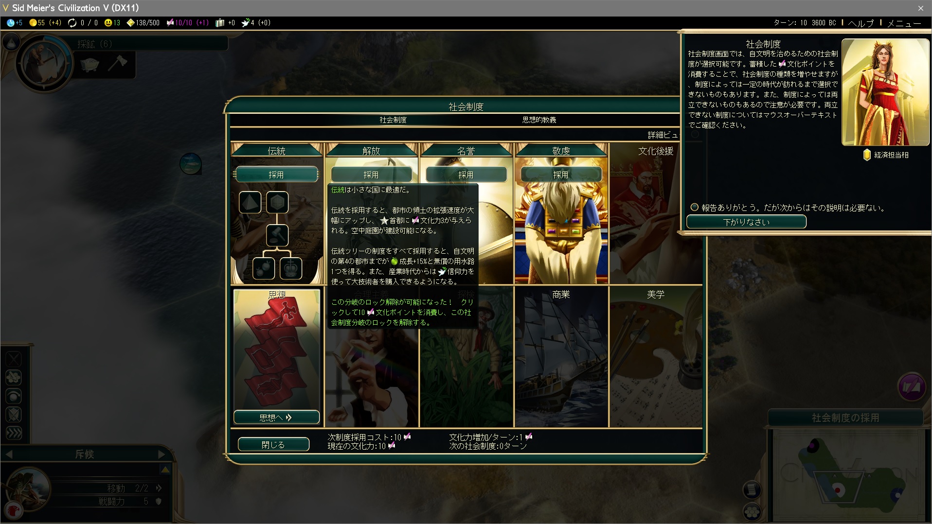伝統・解放・名誉・敬虔の4つどれかを選択できるが、今回は伝統を採用する。以降社会制度は伝統の全ての社会制度を採用する伝統コンプ(コンプリート)を目指す。意味はまだわかんなくていい。