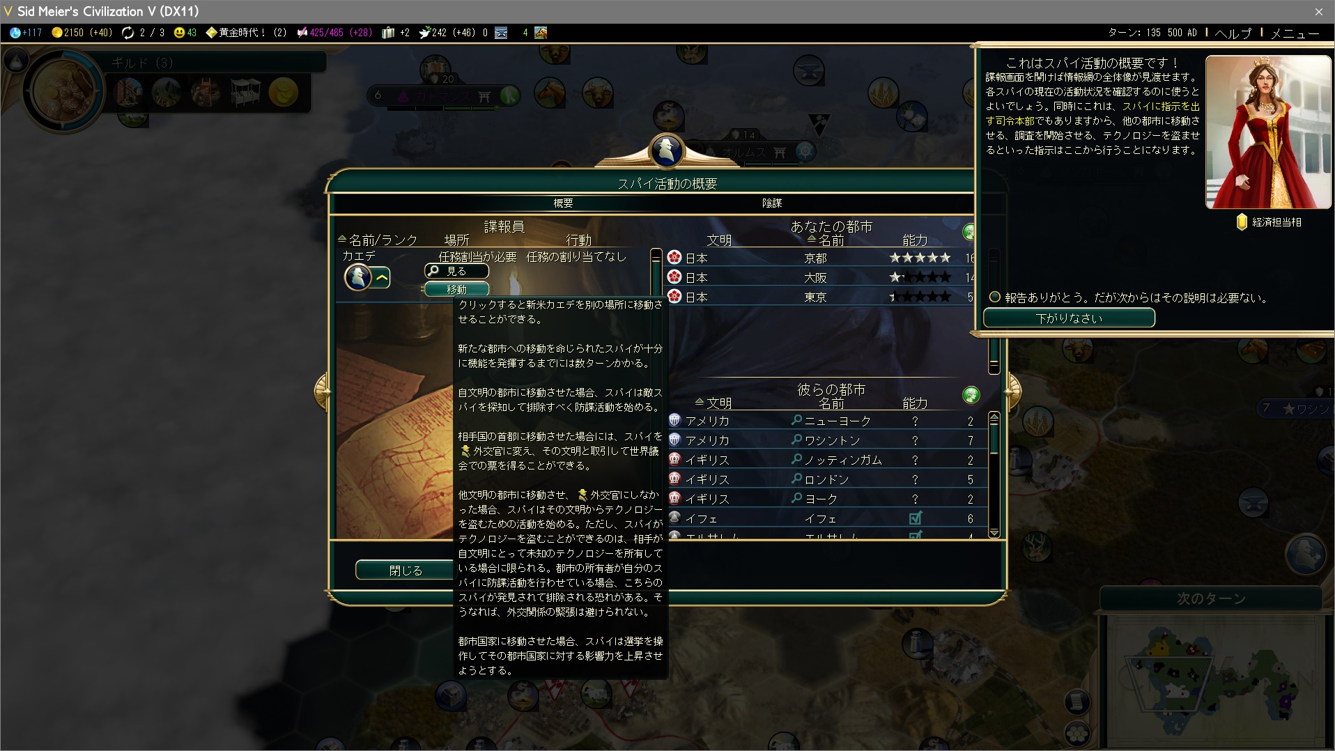 移動をクリックして目的の都市へ潜入する。他文明の都市に潜入することでなんとテクノロジーの奪取が可能だ!