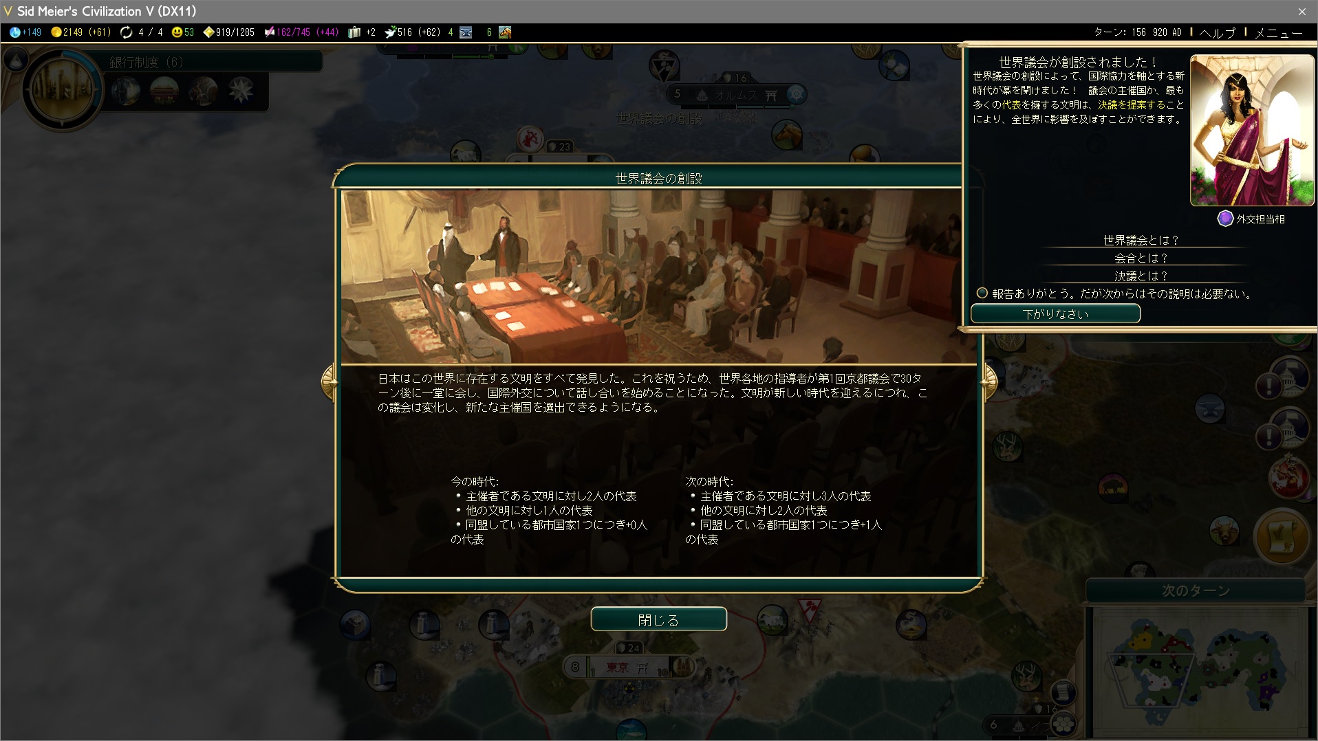 テクノロジー:活版印刷の研究が完了した次ターン、世界議会が始まる。世界議会とは端的に言えば国連のようなもので、議長国と(議長国を除く)最多得票者の計2名が議案を提出、数十ターン後、全文明が賛成か反対かを投票する、といった流れ。