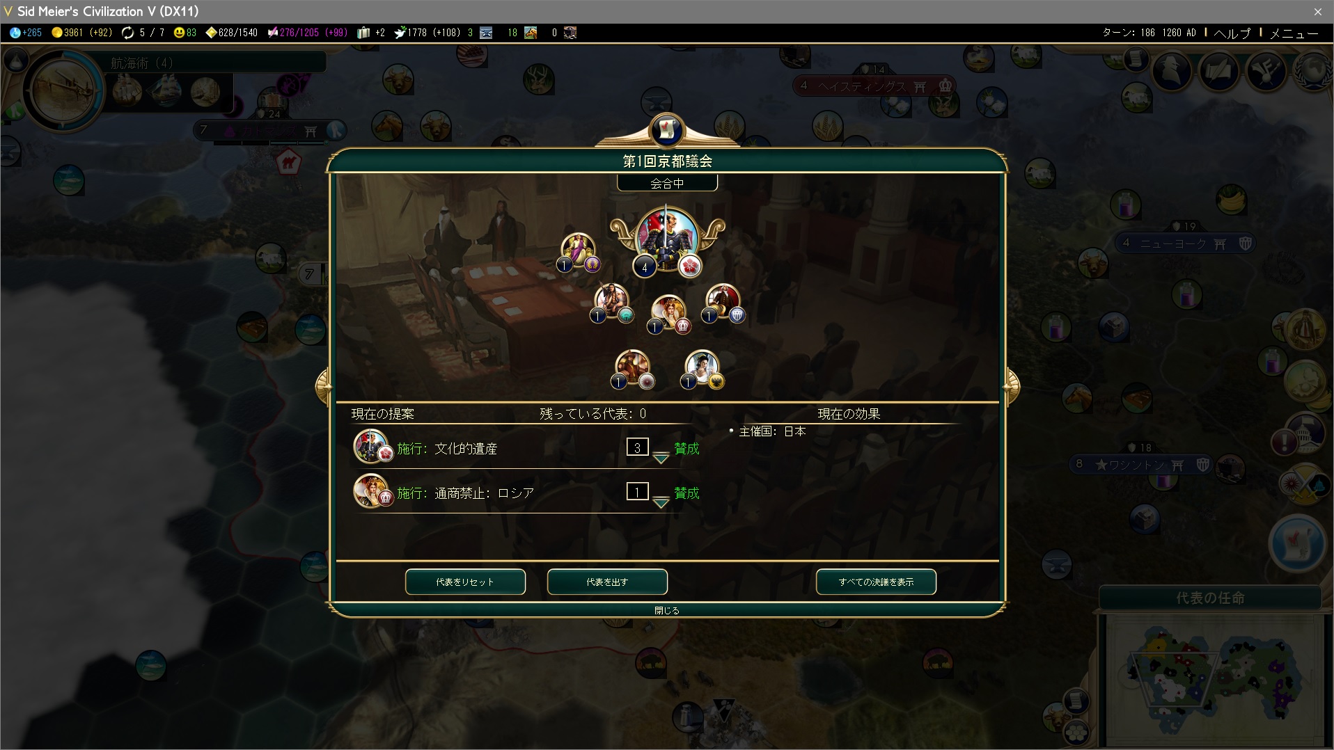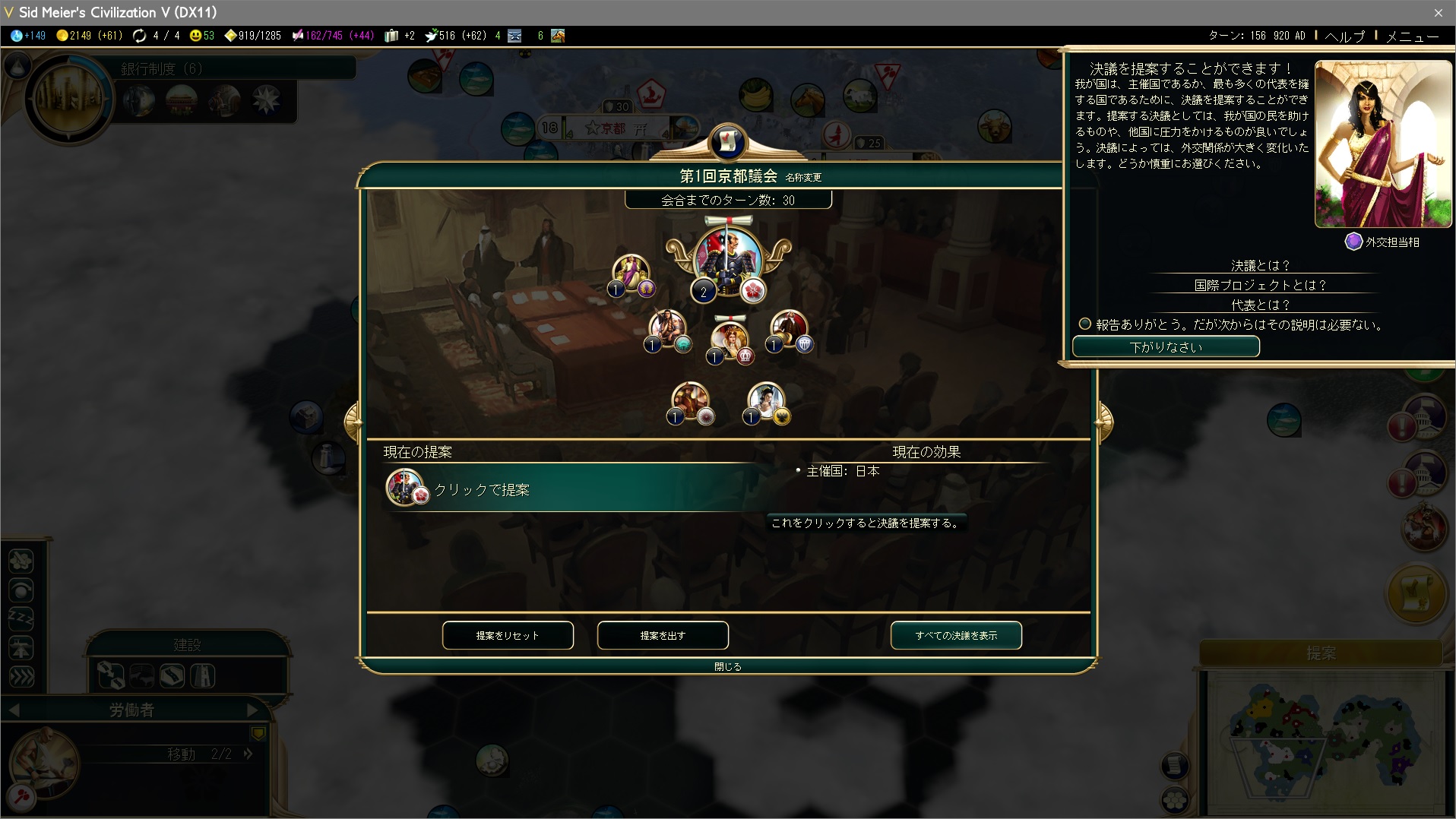 最初の議長国はテクノロジー:活版印刷を最初に研究した文明が選ばれる。議長国が決まれば次は最多得票者が2つ目の議案提出権を得るのだが、全員同票(1票)ならプレイヤーが選出されるぞ。