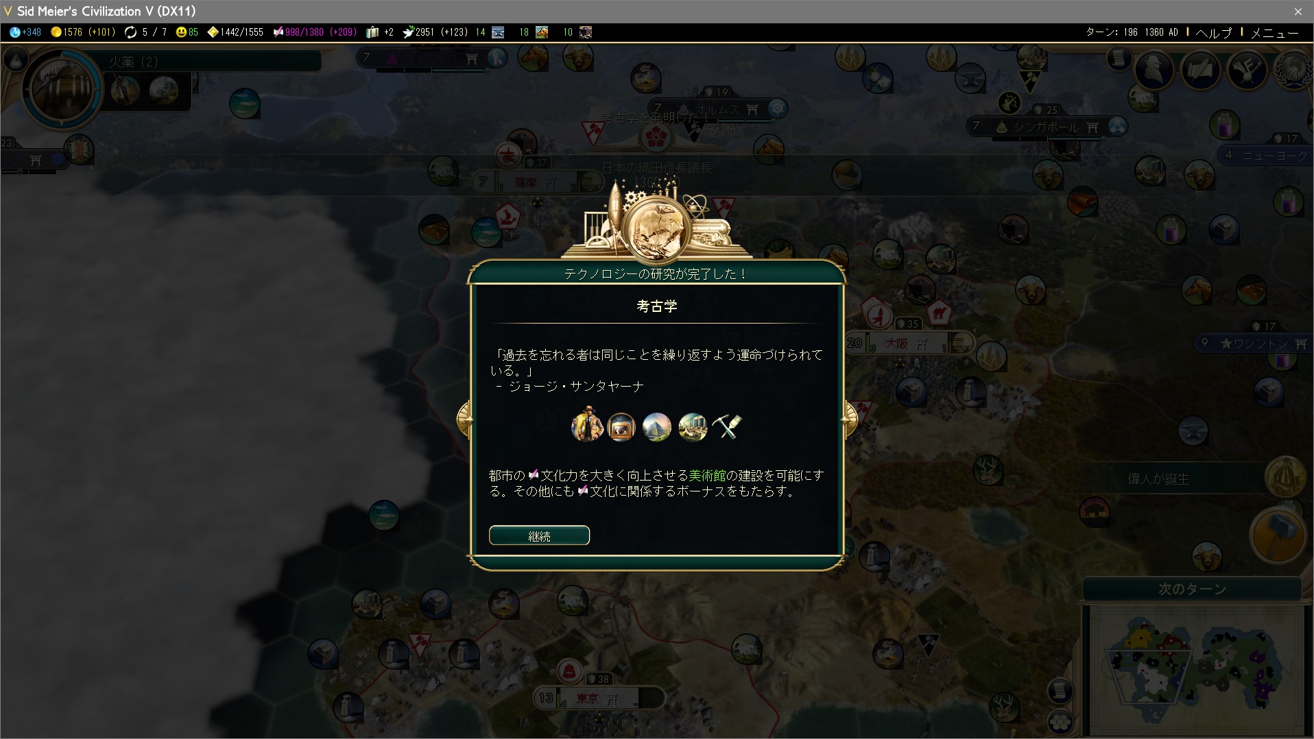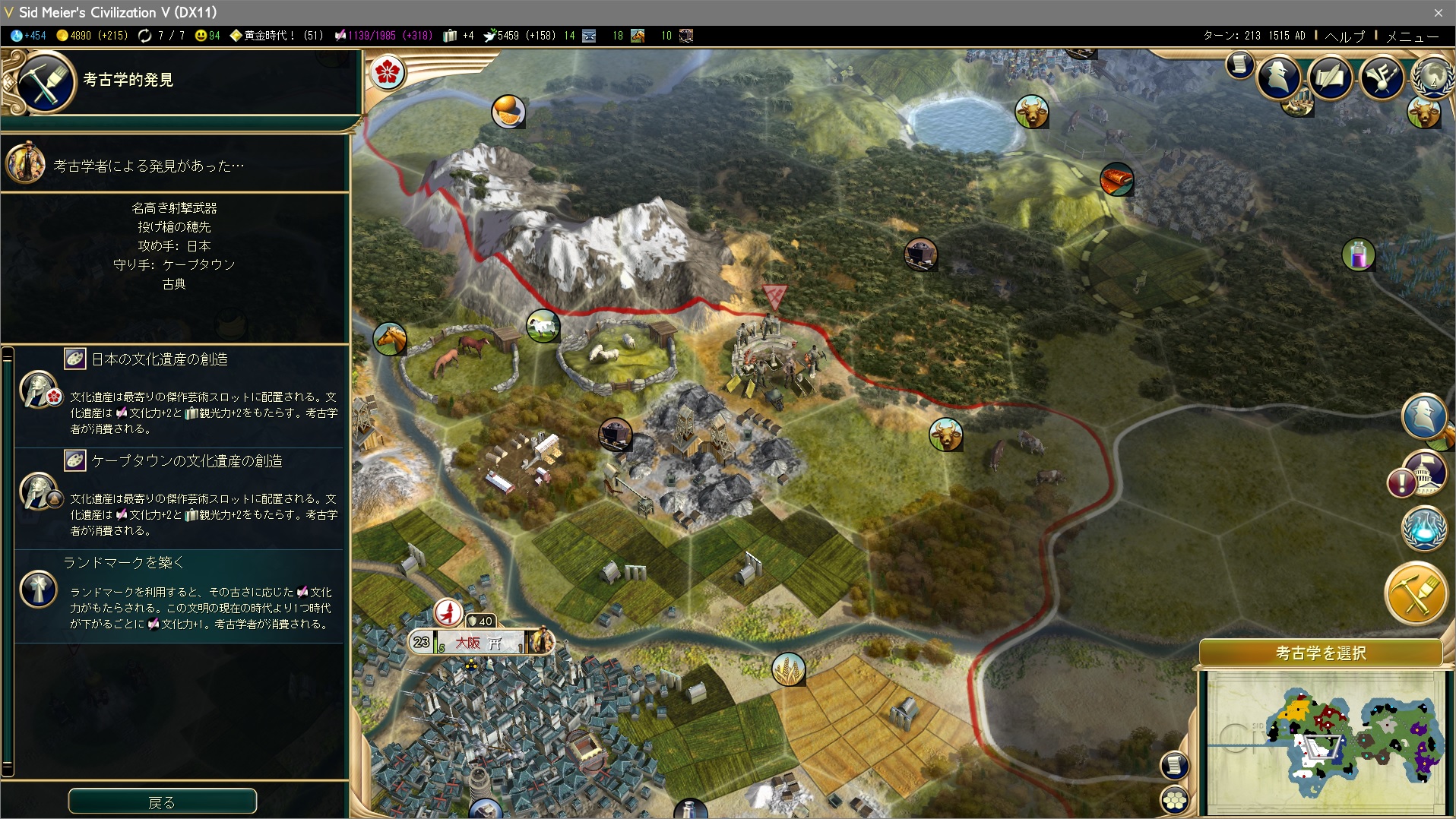 を算出するランドマークになった。ランドマークは強力なタイル出力なので、急いで考古学者を量産しよう。