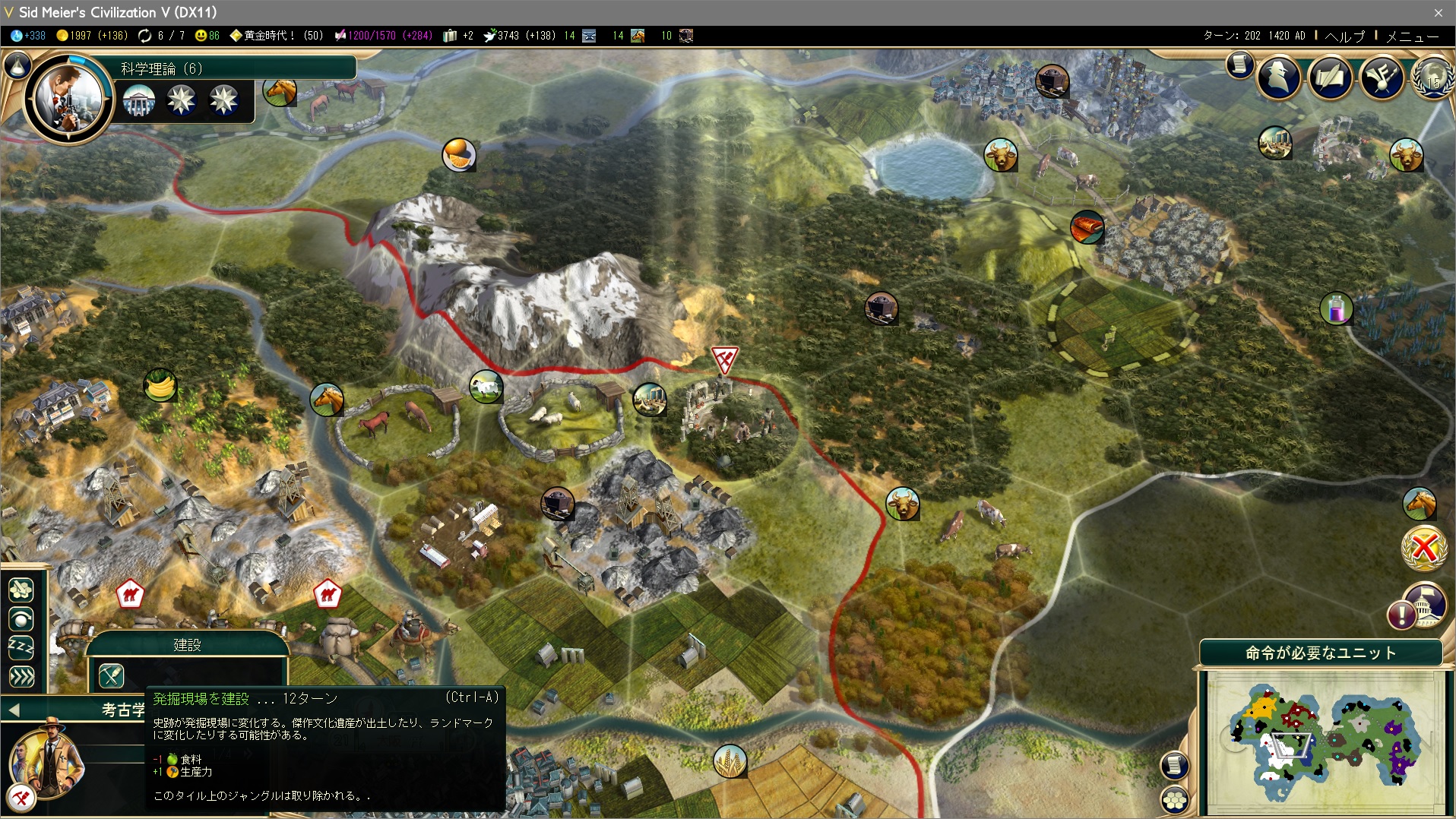 テクノロジー:考古学の研究完了で、考古学者が生産可能になり、史跡が可視化される。考古学者はCiv5の新要素の一つで、かなり特殊なユニットだ。簡単に説明してみよう。