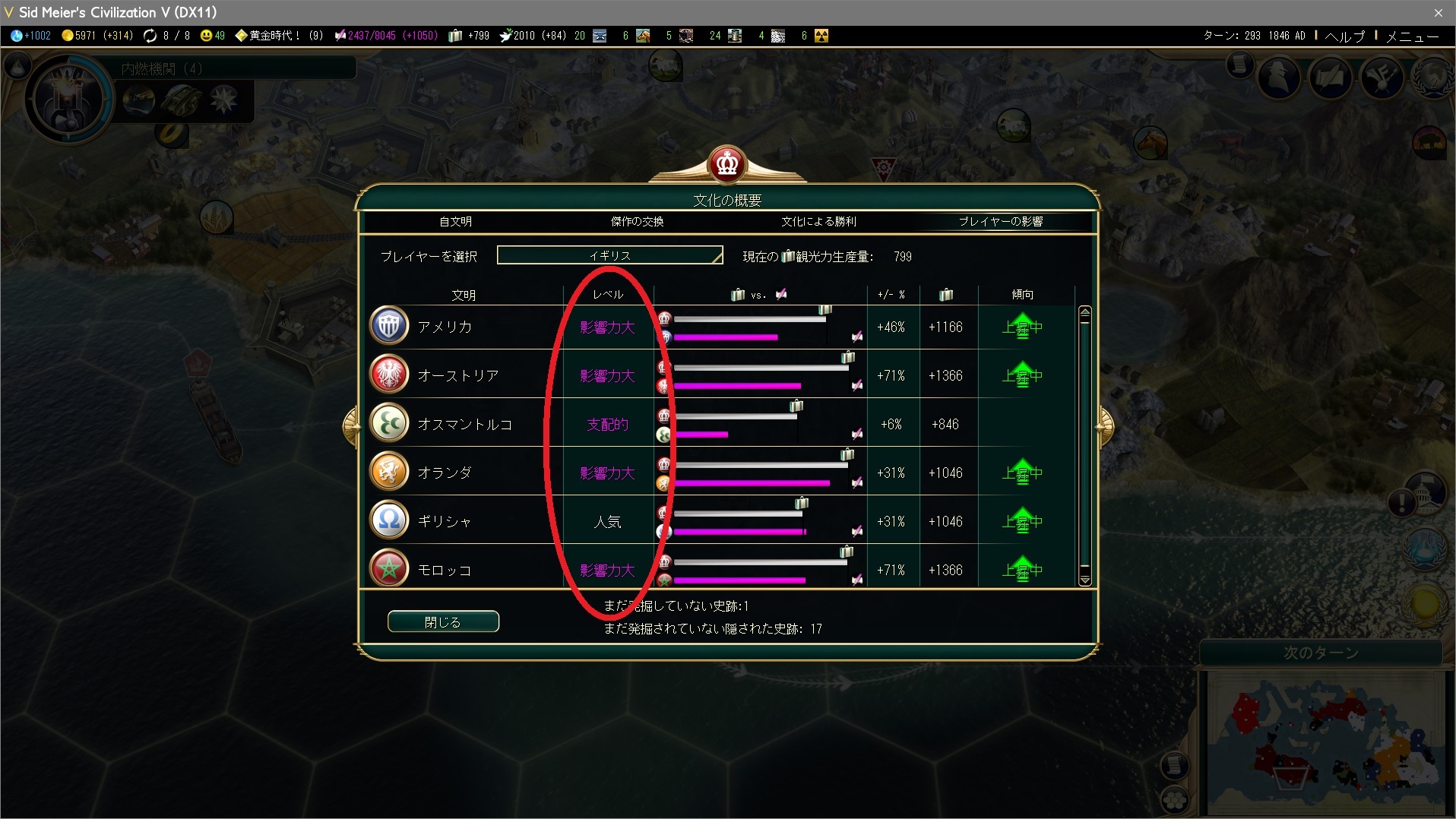画像の銀色の観光バーと紫色の文化バーを見ると、レベル:影響力大の文明に対して観光力>文化力になってるのがわかるだろう。