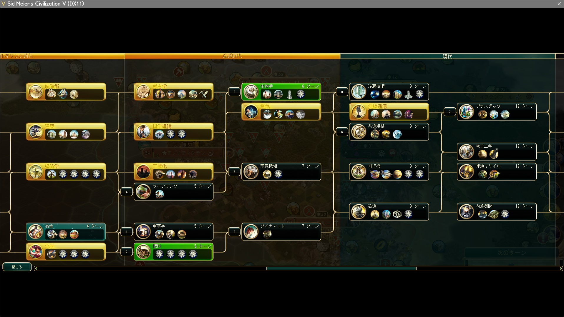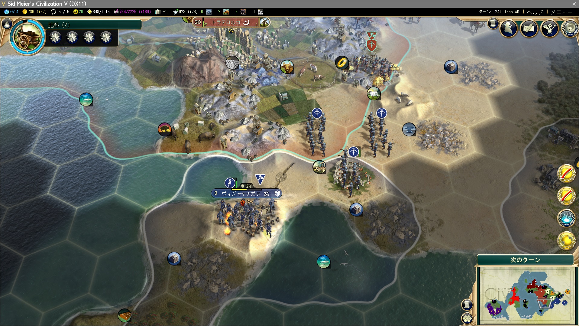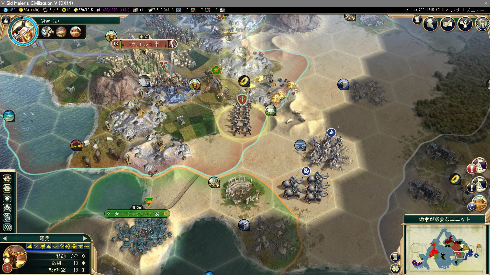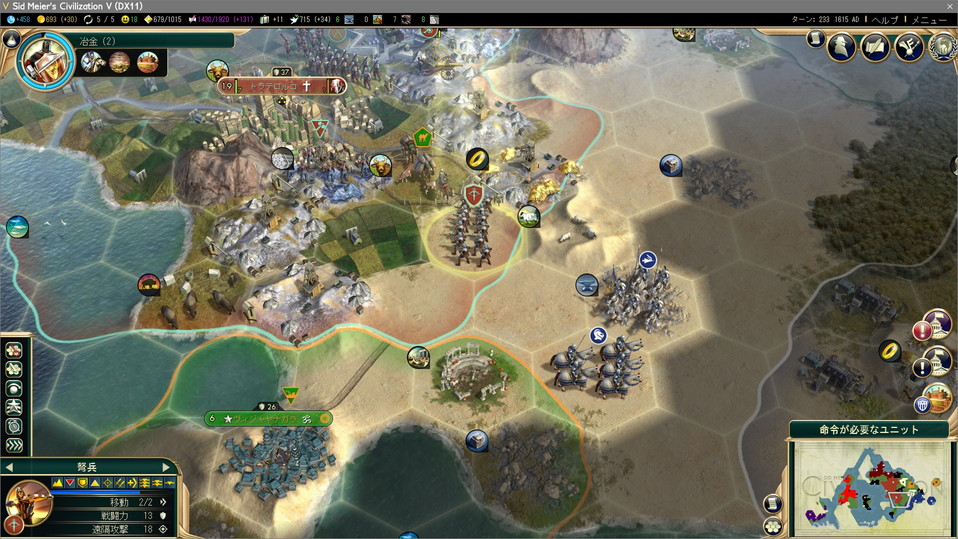 前回同様、大砲ラッシュを仕掛け、傑作&世界遺産を奪う予定。ハンマー、高級資源、研究協定の数、その他もろもろ足りてない。まあ自文明以外産業時代入りもまだだから大丈夫か。