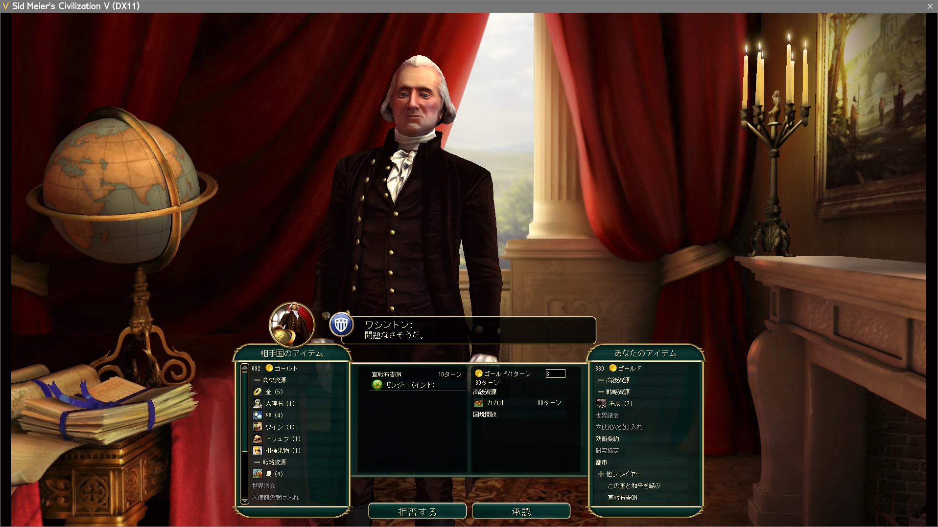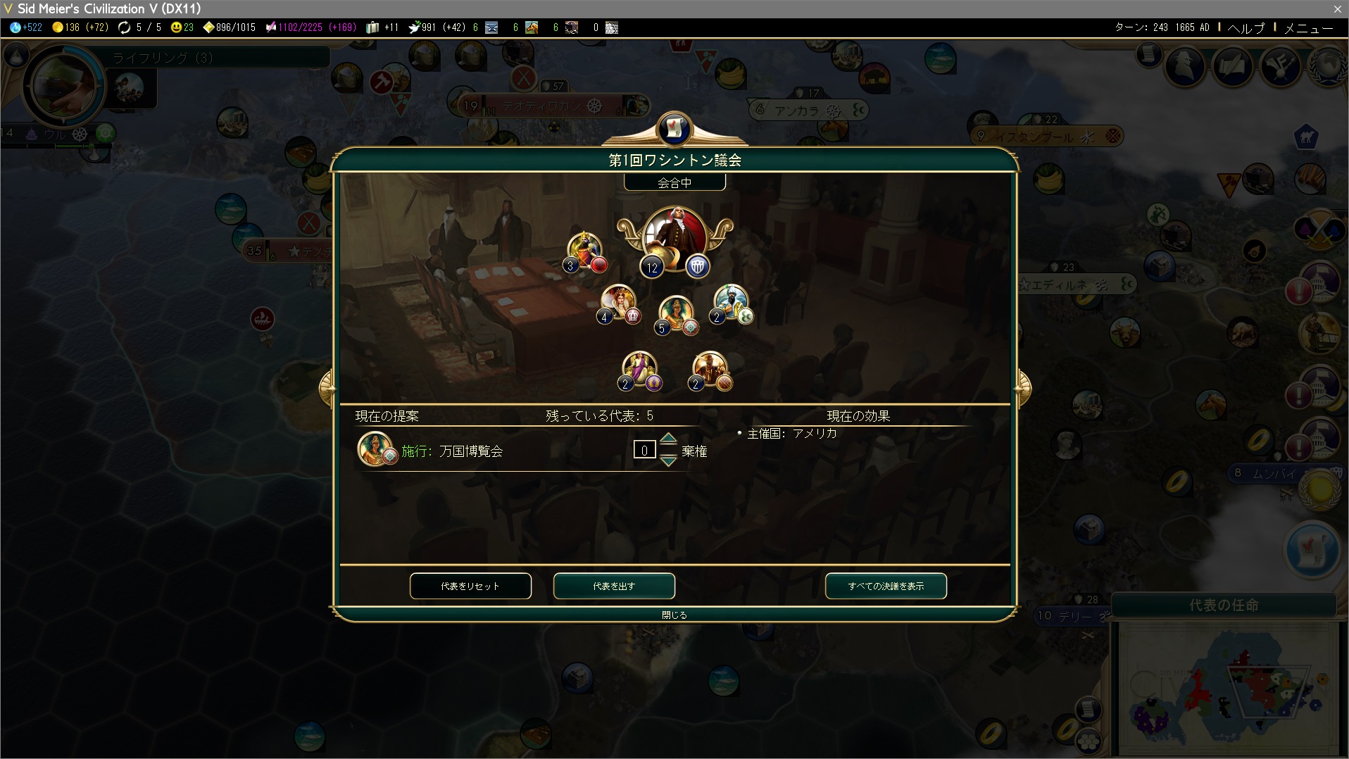 取引で資源やゴールドを対価に決議の票を集めることができる。資源輸出入や研究協定と同様、外交交渉画面で取引できるぞ。