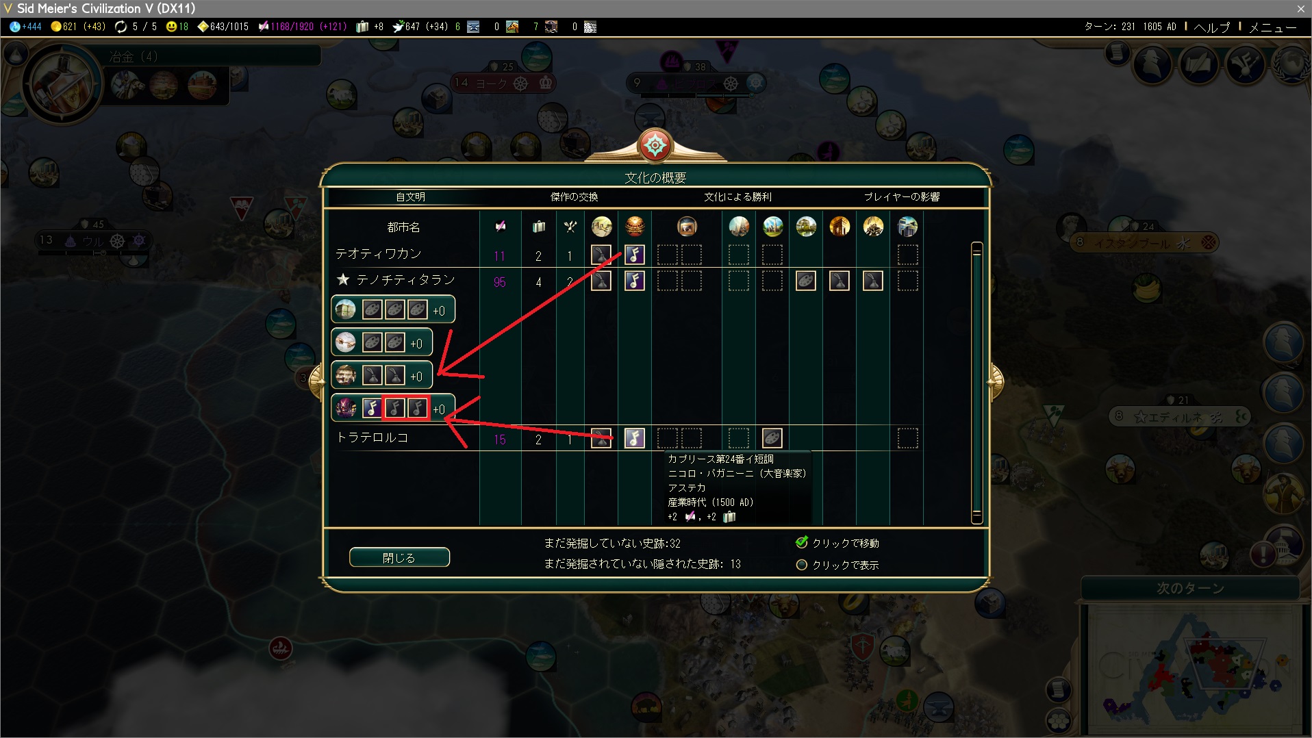 ブロードウェイのテーマ化ボーナス達成条件『同じ文明・同じ時代』を『アステカ・産業時代』の3つの傑作音楽で達成。観光力・文化力に+3される。