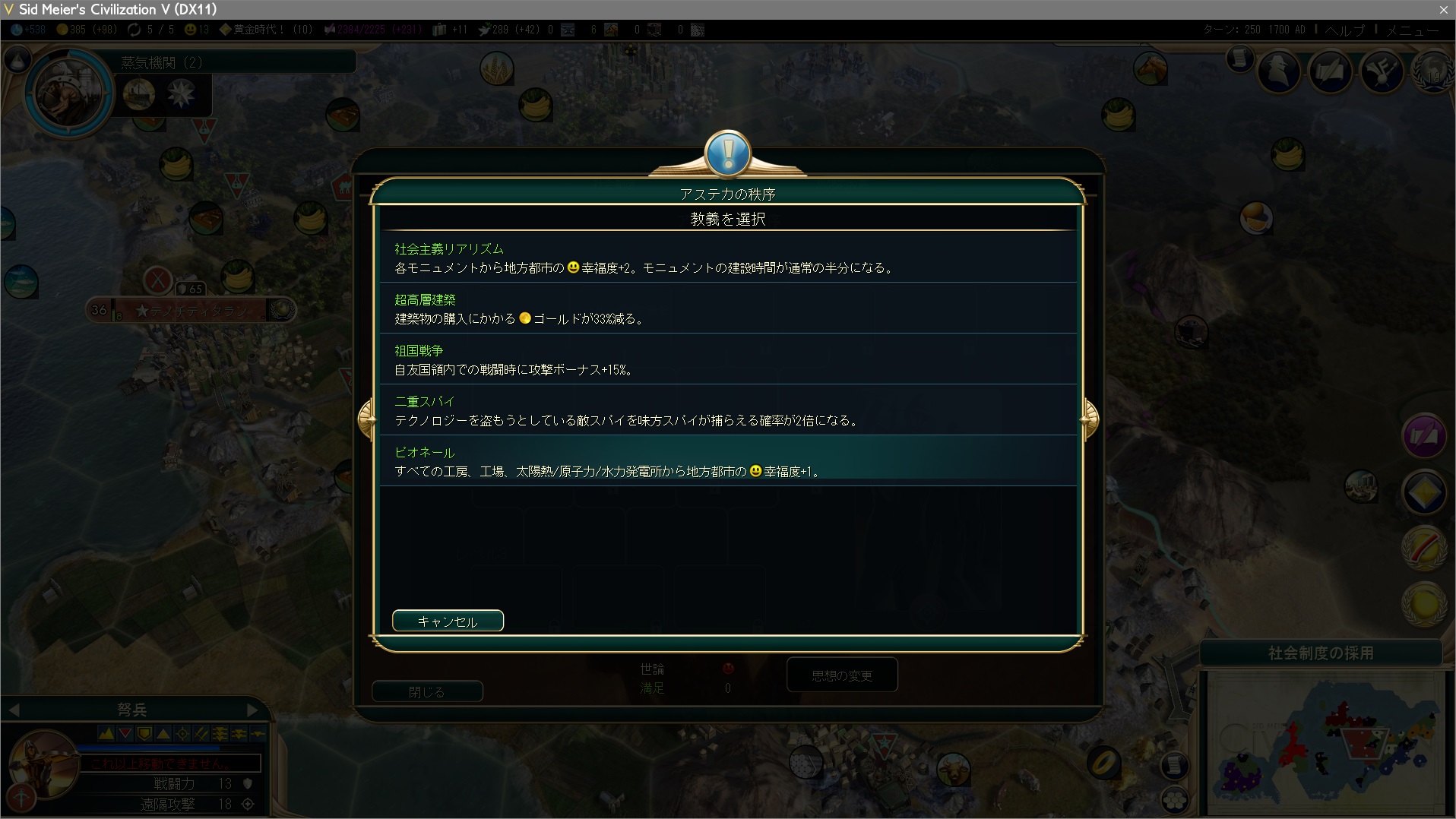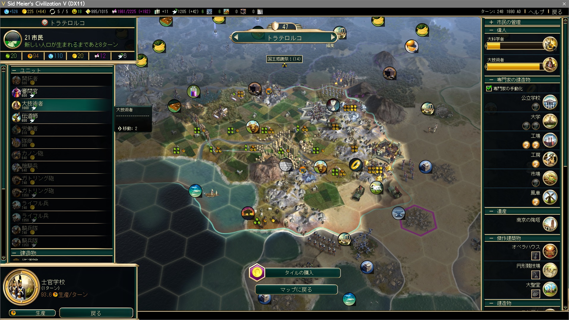万国博覧会金賞に目処が立ったので軍事都市で士官学校&ブランデンブルク門の生産。10ターン近くも待ってらんないので、大技術者を信仰力で購入して投入するとしよう。