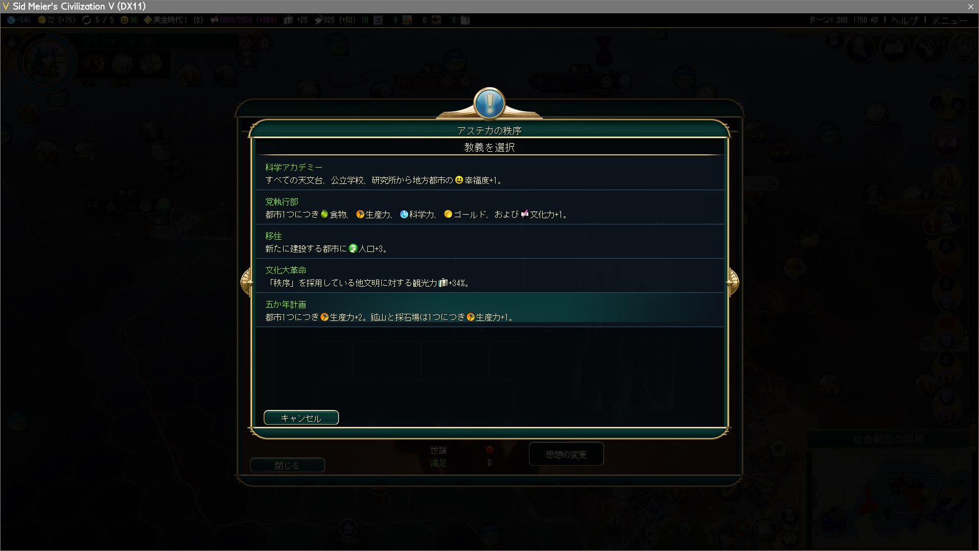 文化大革命…じゃなくて五カ年計画を選択。当然だね、自文明以外秩序どころか誰も思想採用してないもんね。
