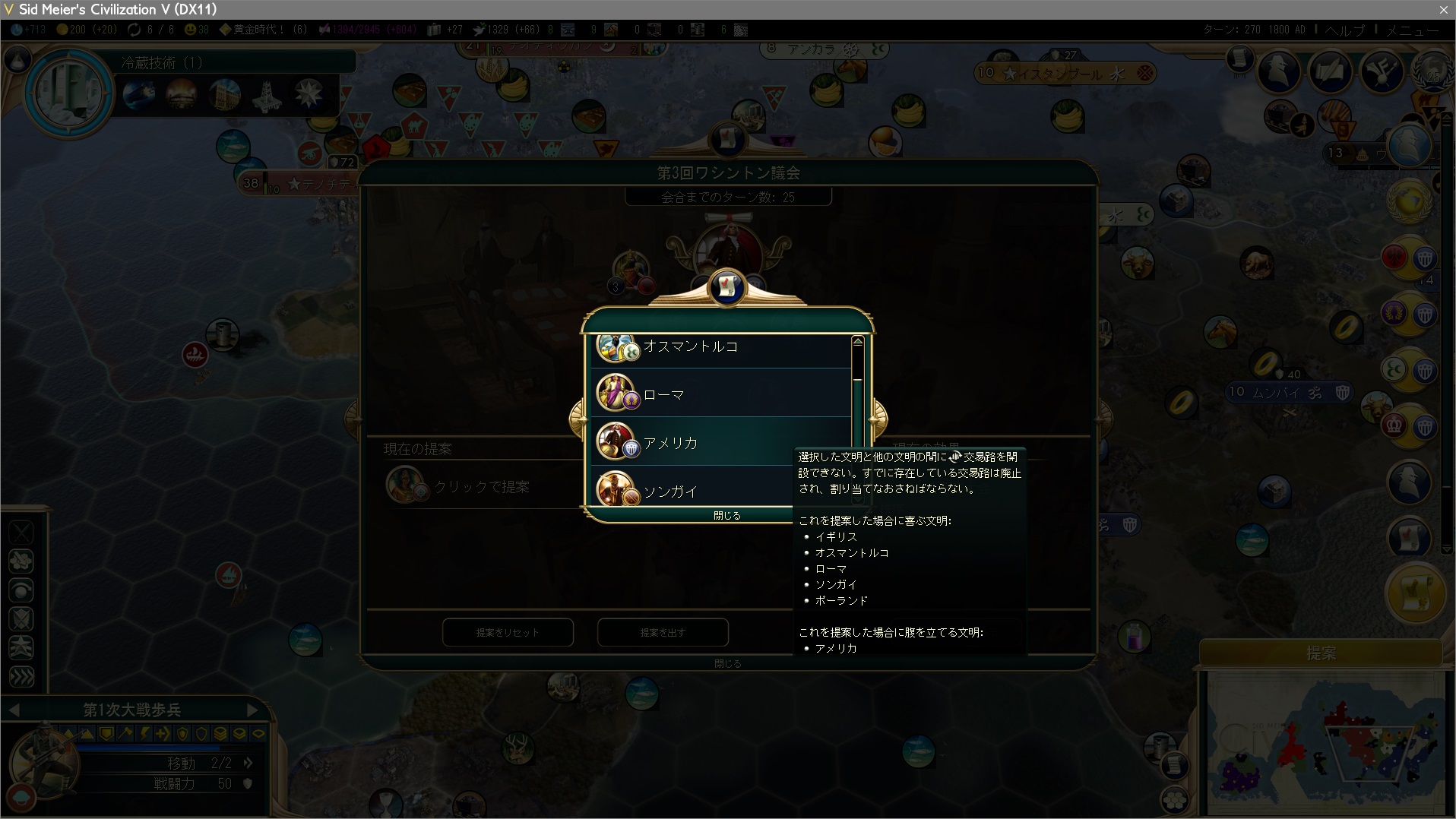 おまけの通商禁止:アメリカの提出!アメリカに嫌われ、それ以外の全文明に好かれ。実は文化勝利には都合が悪い(交易路が繋げなくなる)のだが、事がうまく運べばデメリットはなくなるはず…