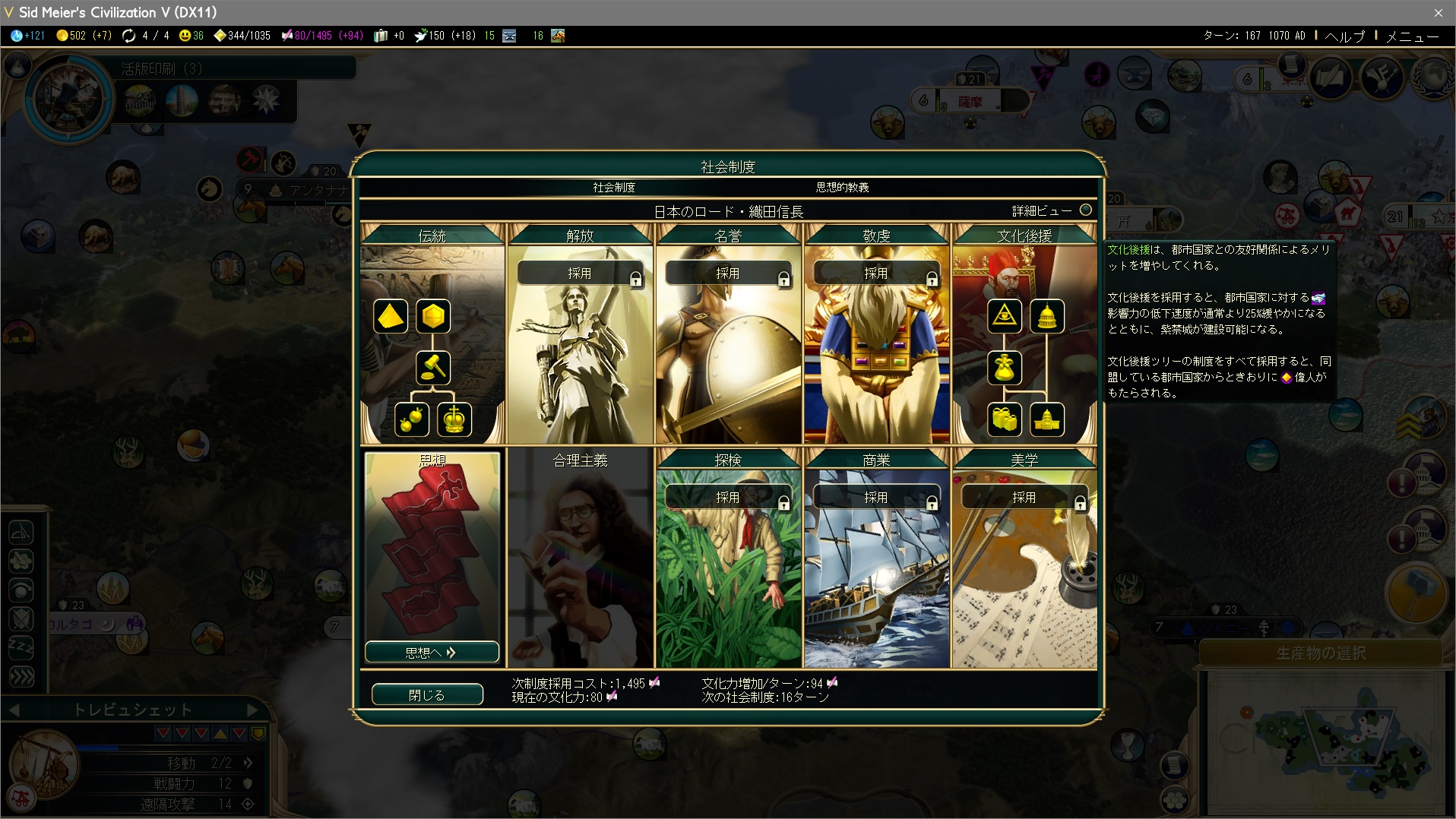 多くの文化都市国家と同盟できているから、ルネサンス入りまでに文化後援コンプしちゃったぞ。コンプボーナスでたまに偉人がもらえる。大商人を引きませんように…