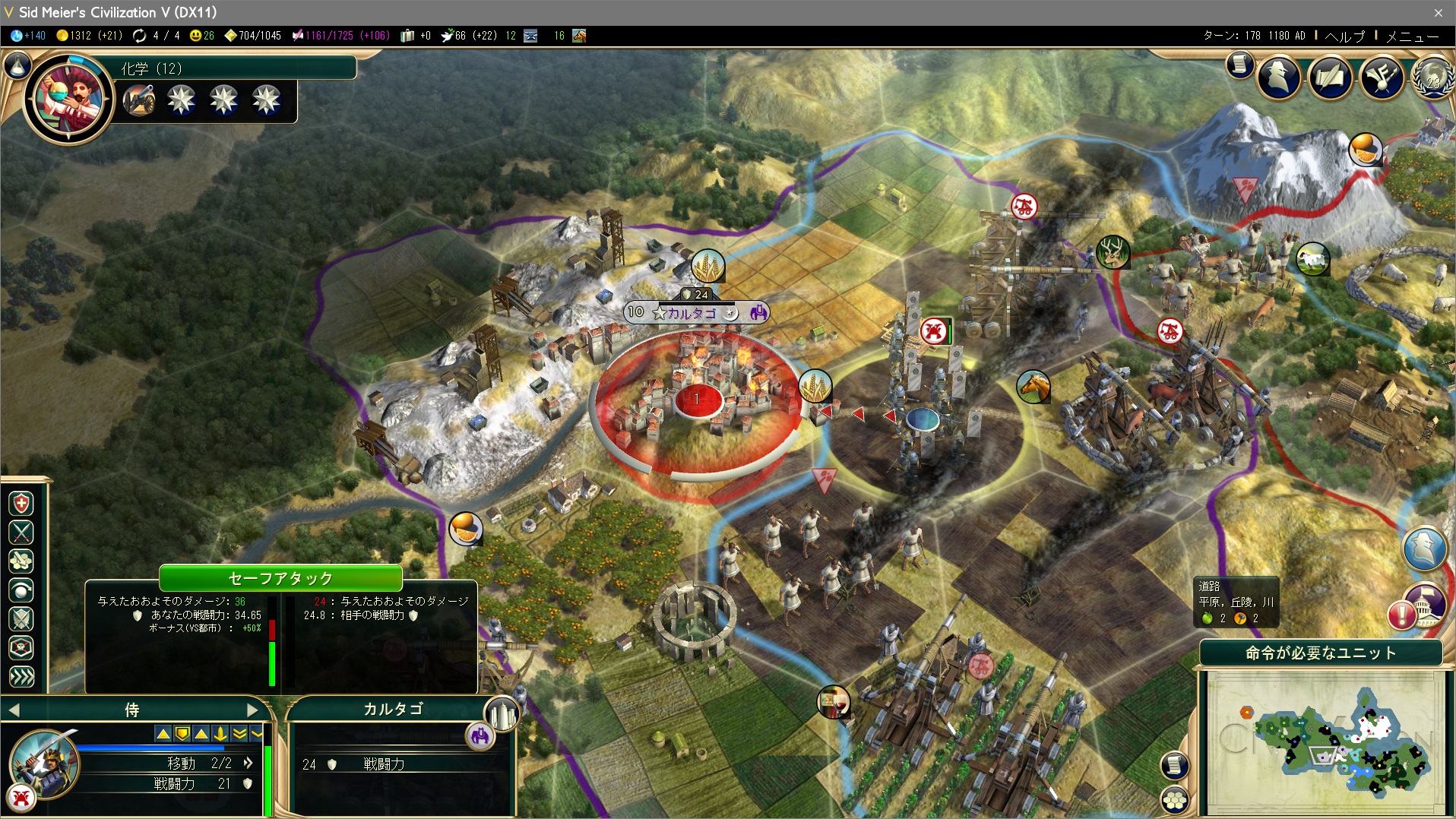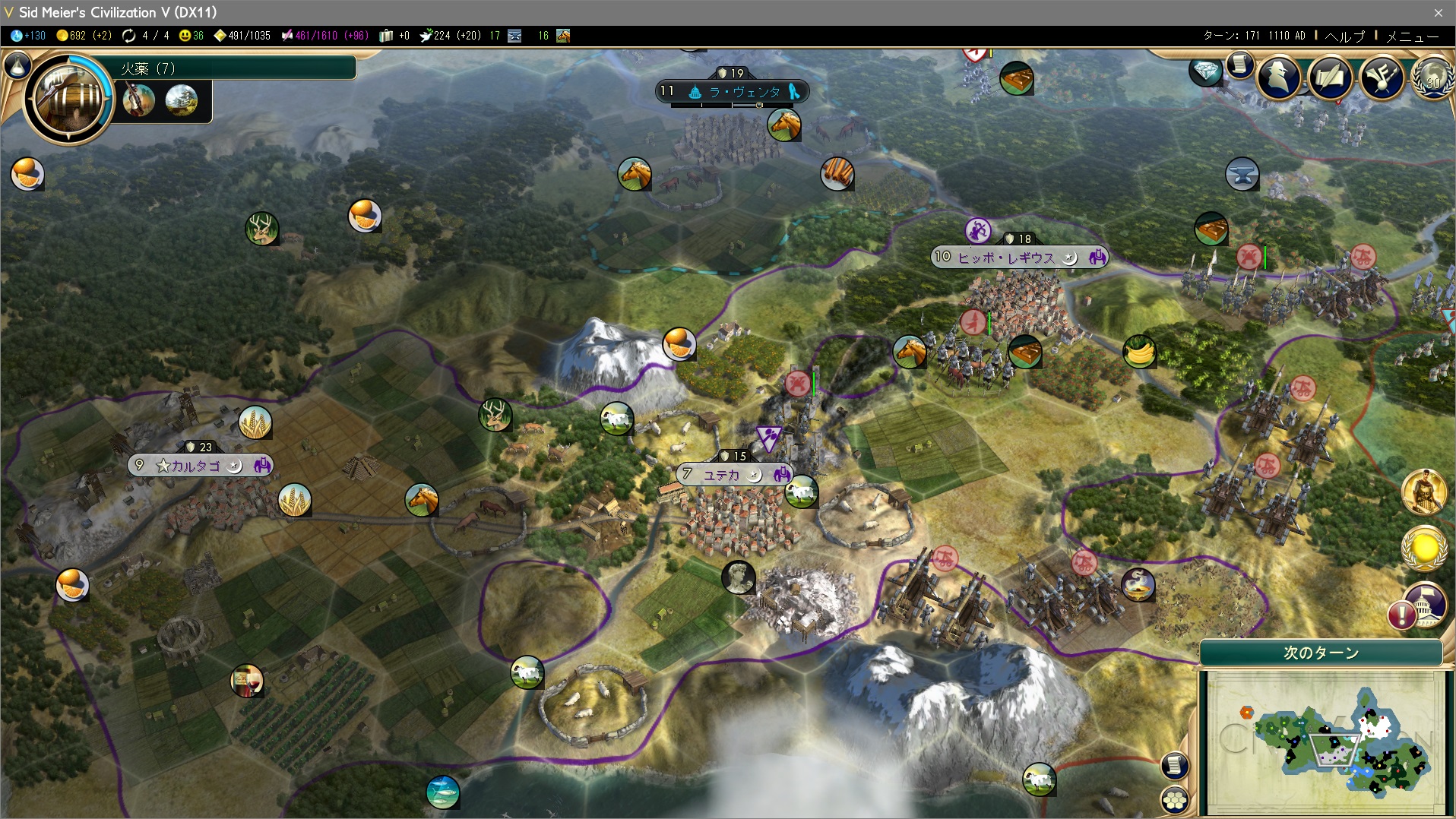 首都:カルタゴを占領して対カルタゴ戦は終了。ストーンヘンジ、チチェン・イツァ、パルテノン神殿の3つの世界遺産と、3つの都市(首都2つ)を獲得。まあ、悪くないかな…。
